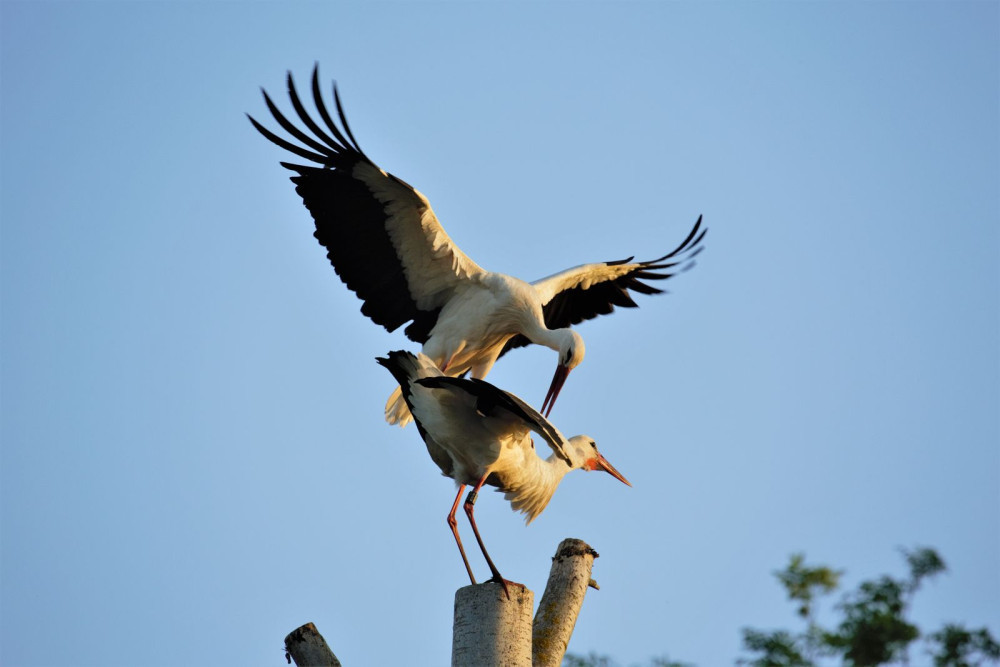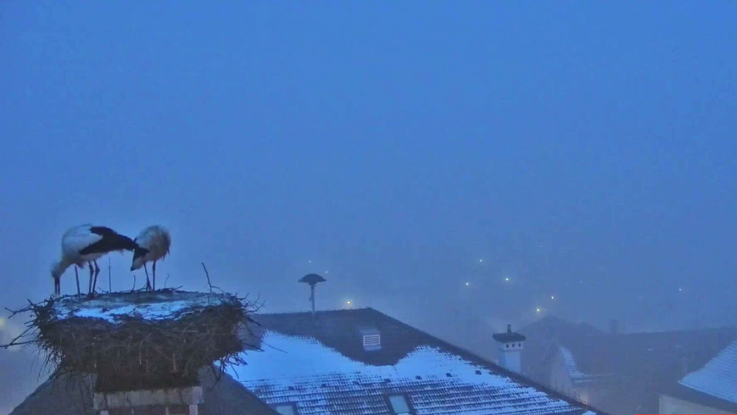 První čápi se vracejí ze zimovišť. Jeden pár má výhled na zasněženou sjezdovku