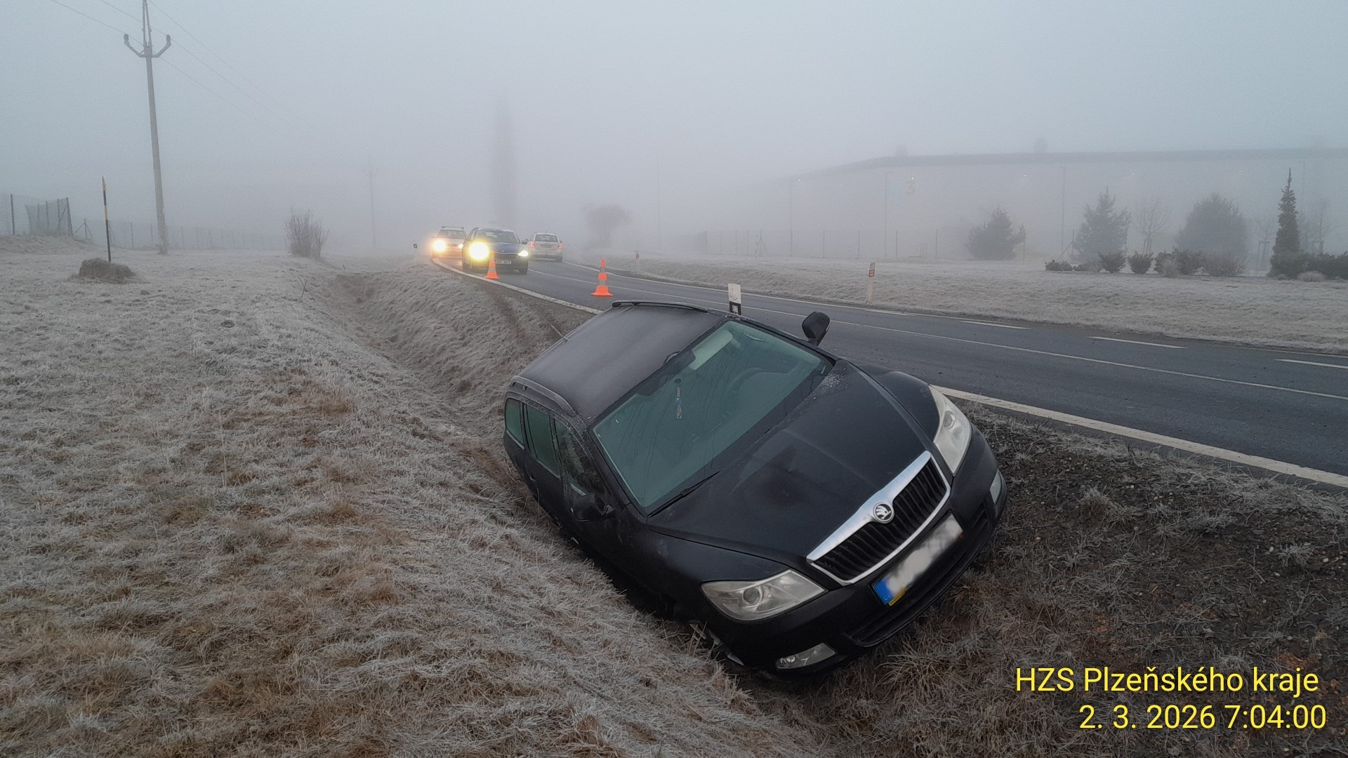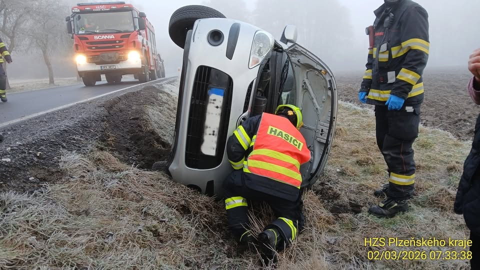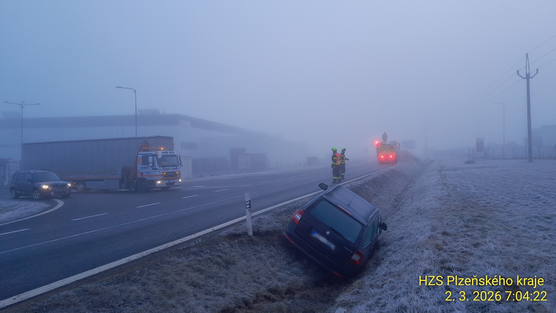 Silnice jsou namrzlé. Hasiči a záchranáři vyjíždějí k nehodám po celém kraji