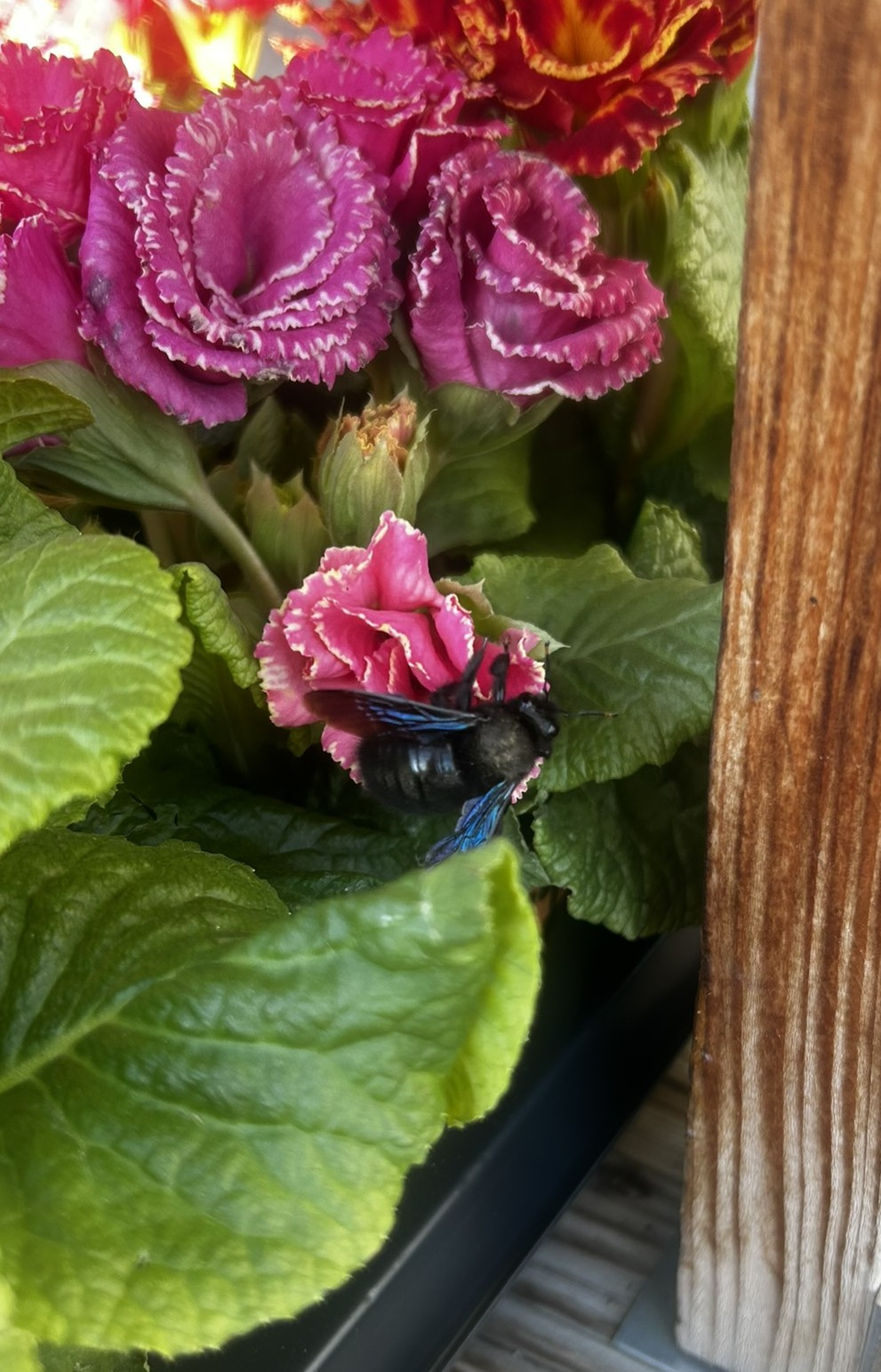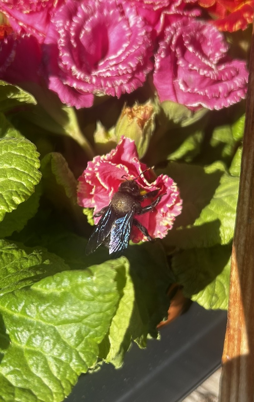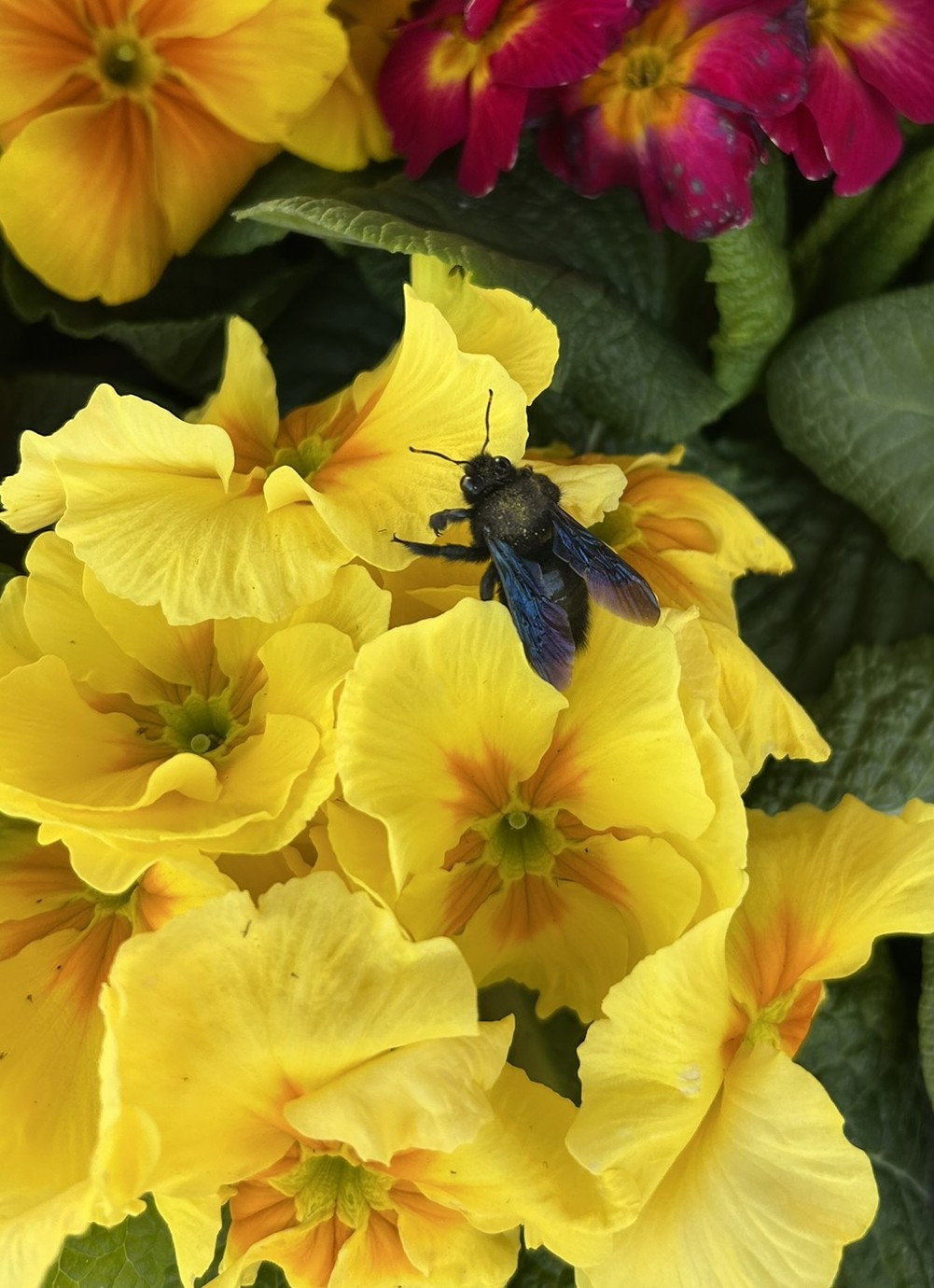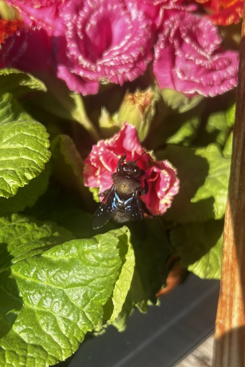Obří černá včela zavítala do květinářství. Drvodělku přilákaly rozkvetlé petrklíče