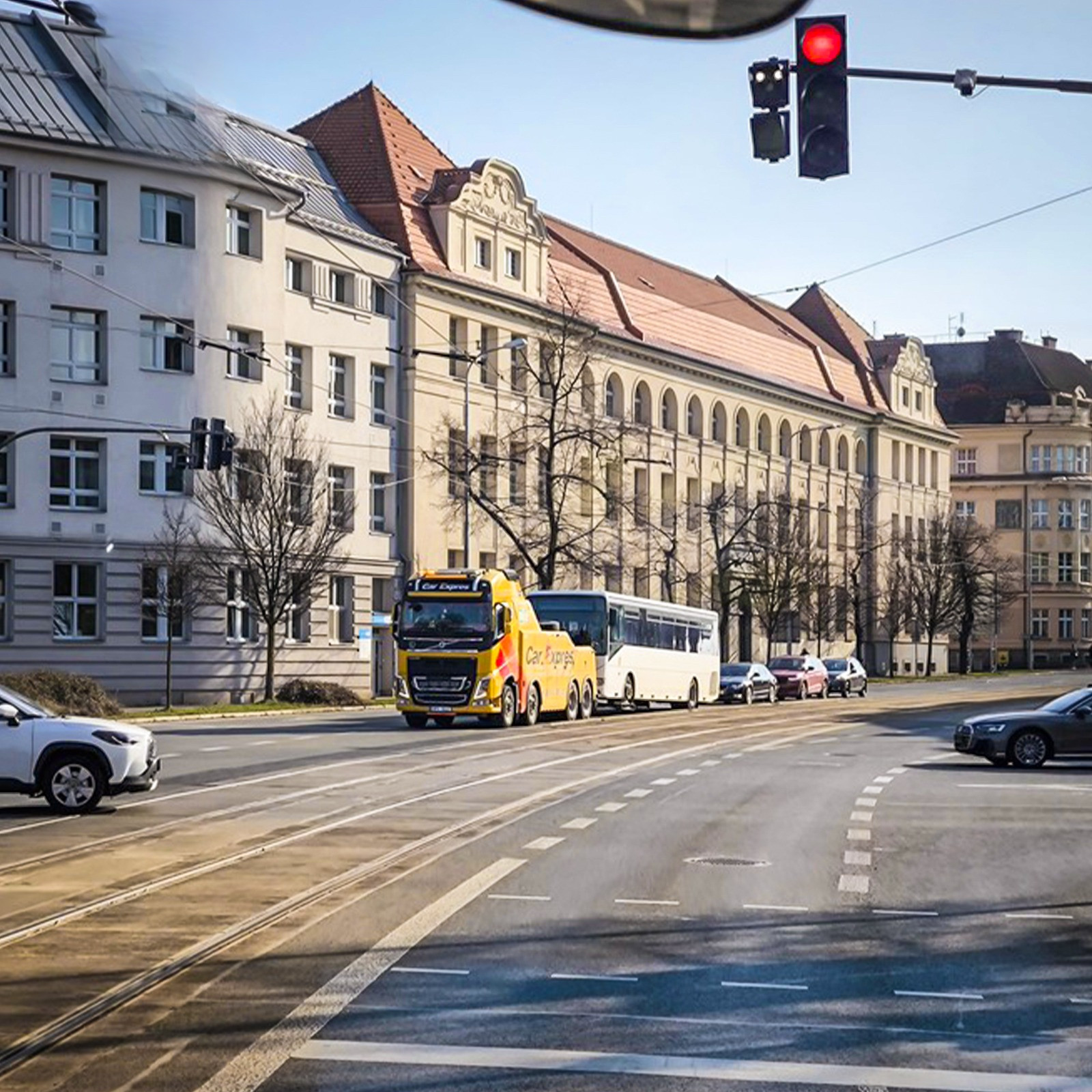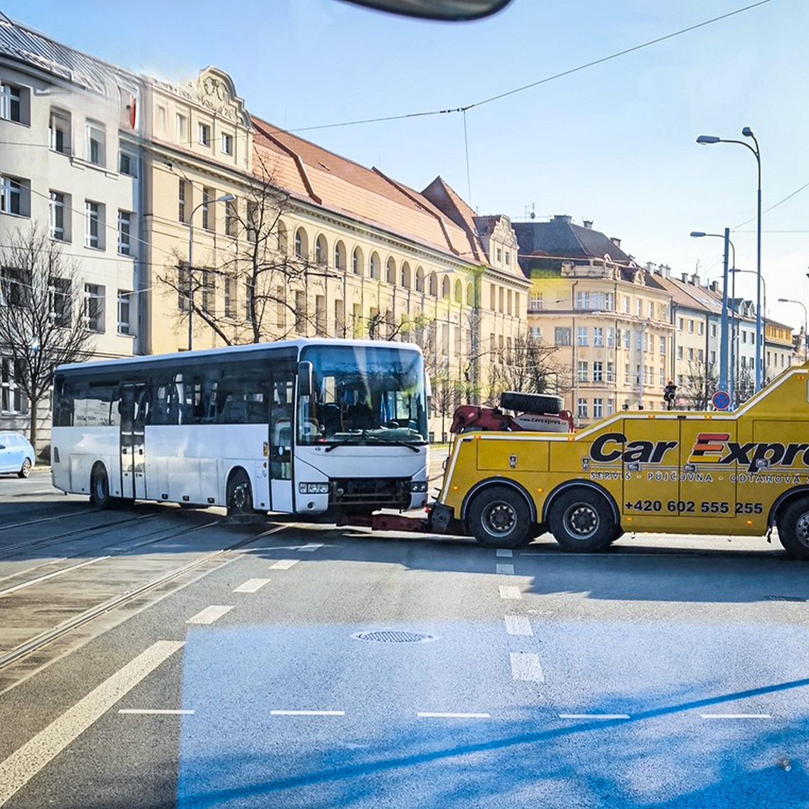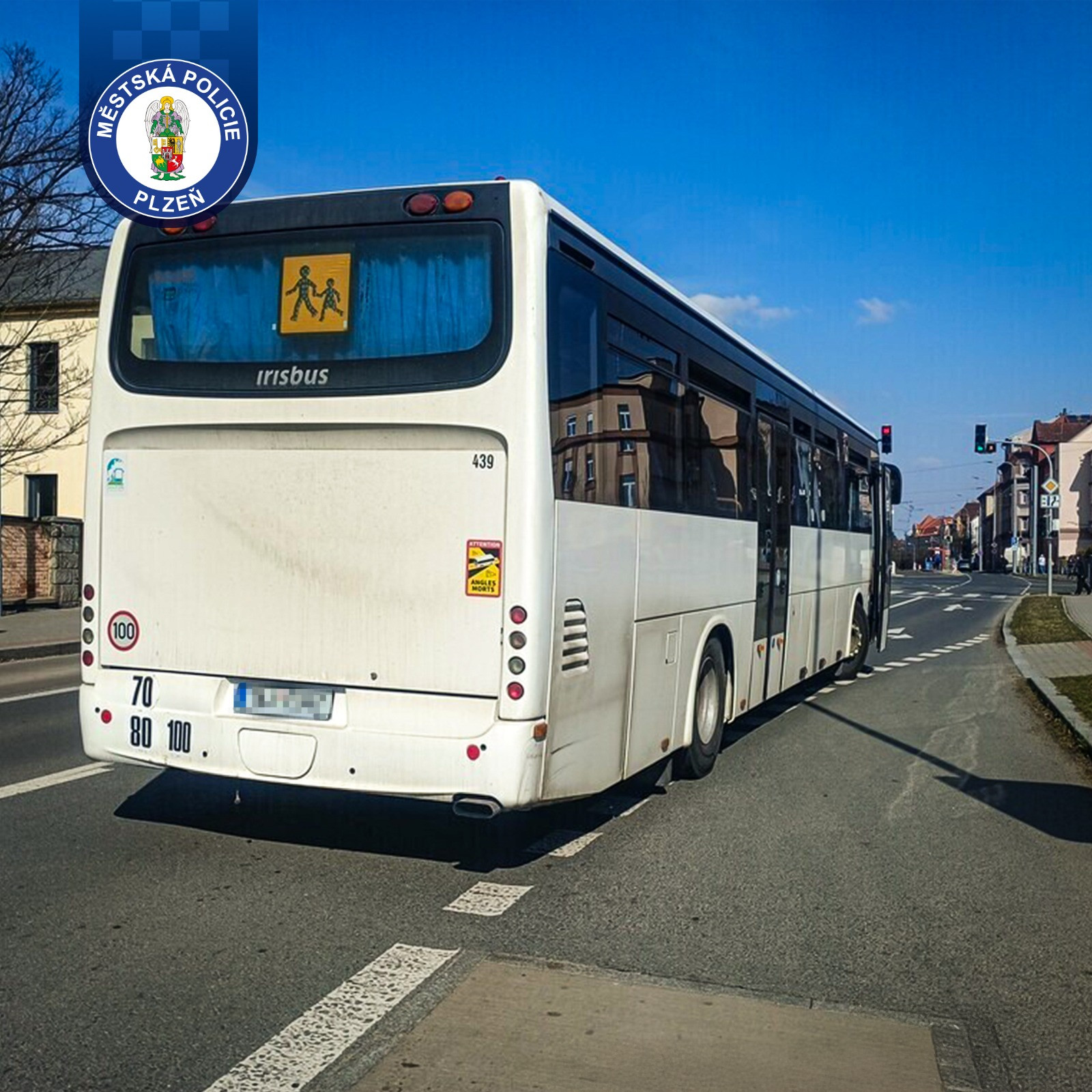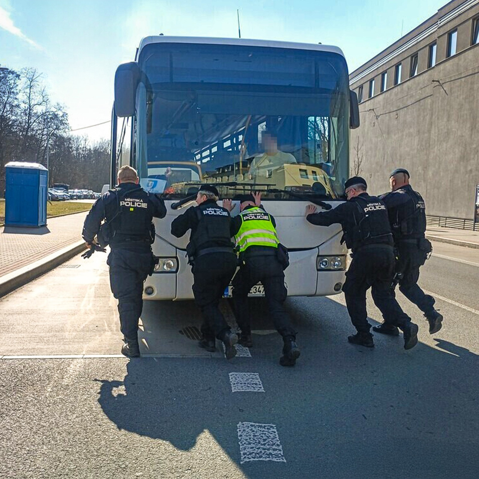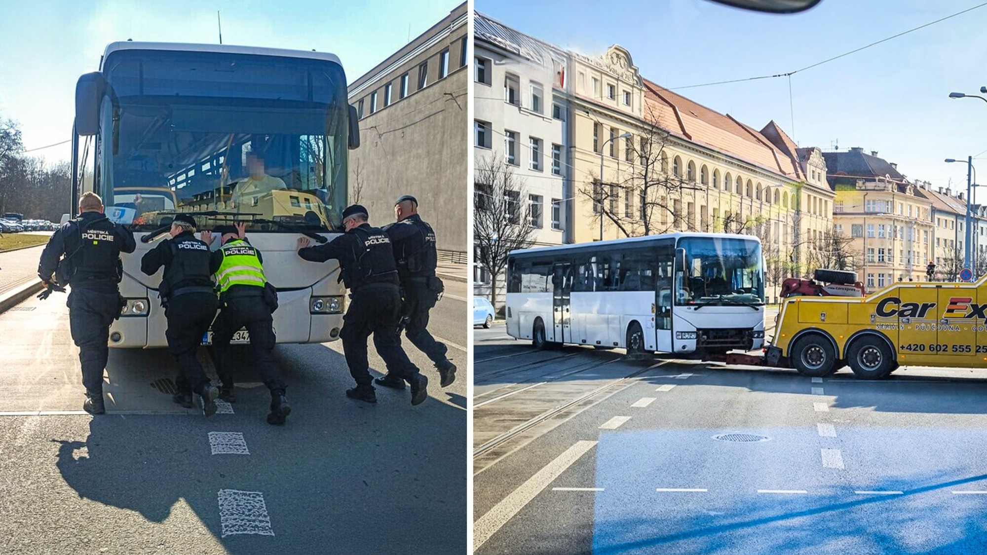 Strážníci odtlačili rozbitý autobus blokující velmi rušnou křižovatku. Zabránili tak kolapsu dopravy