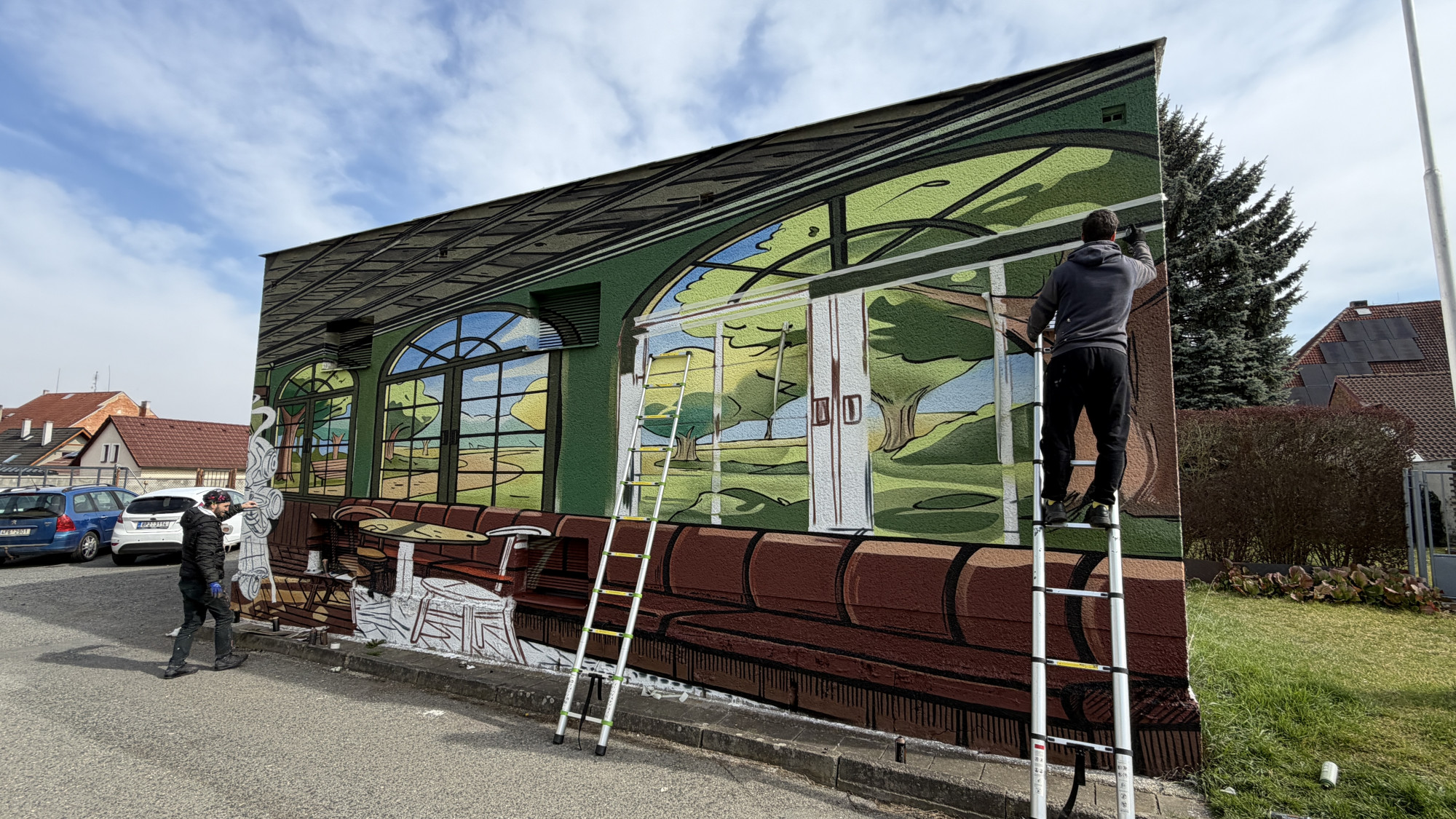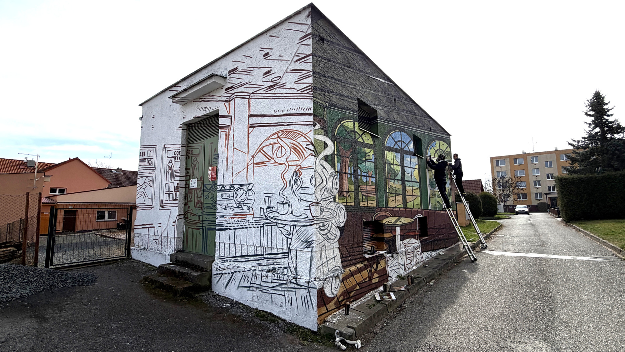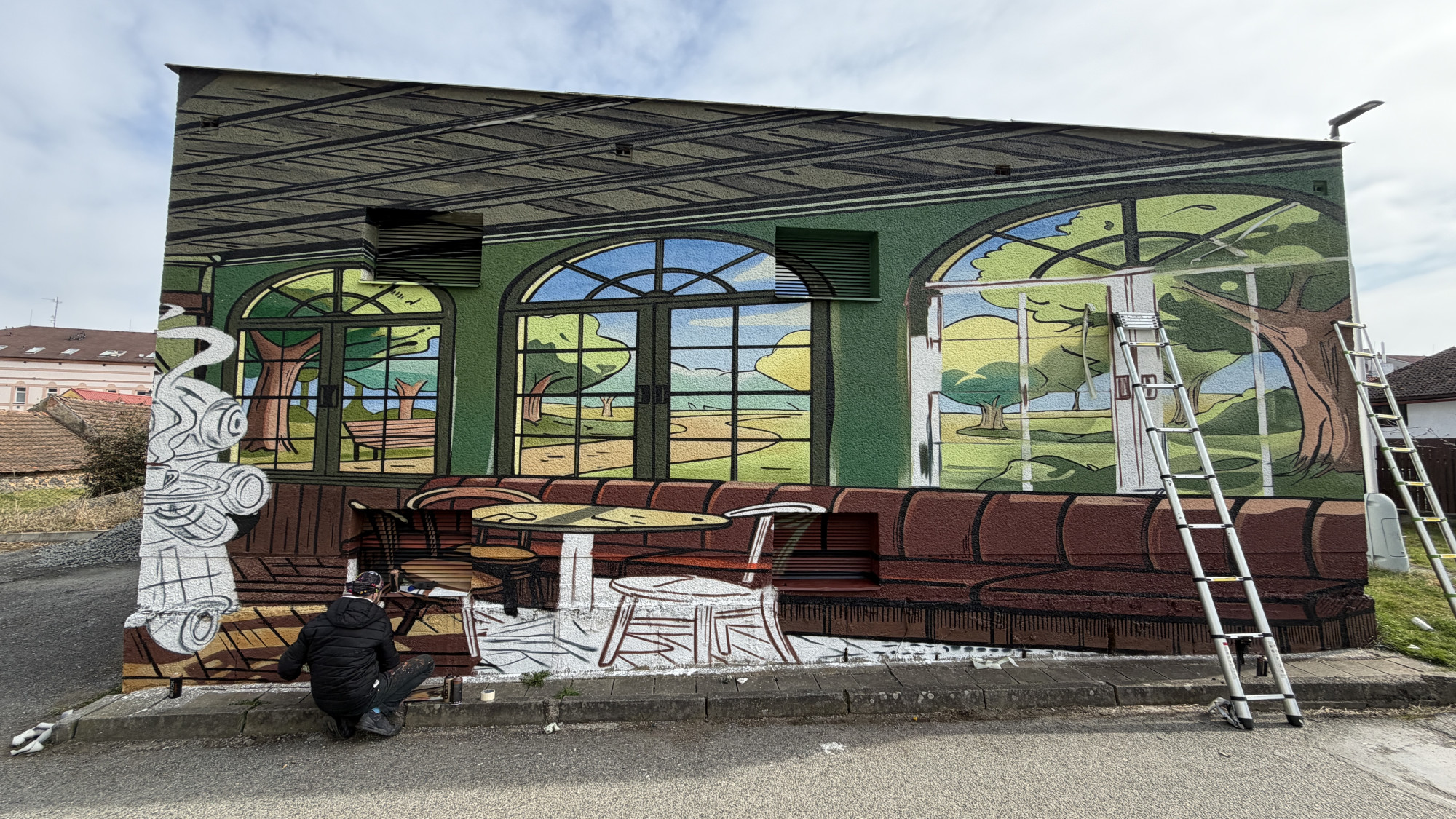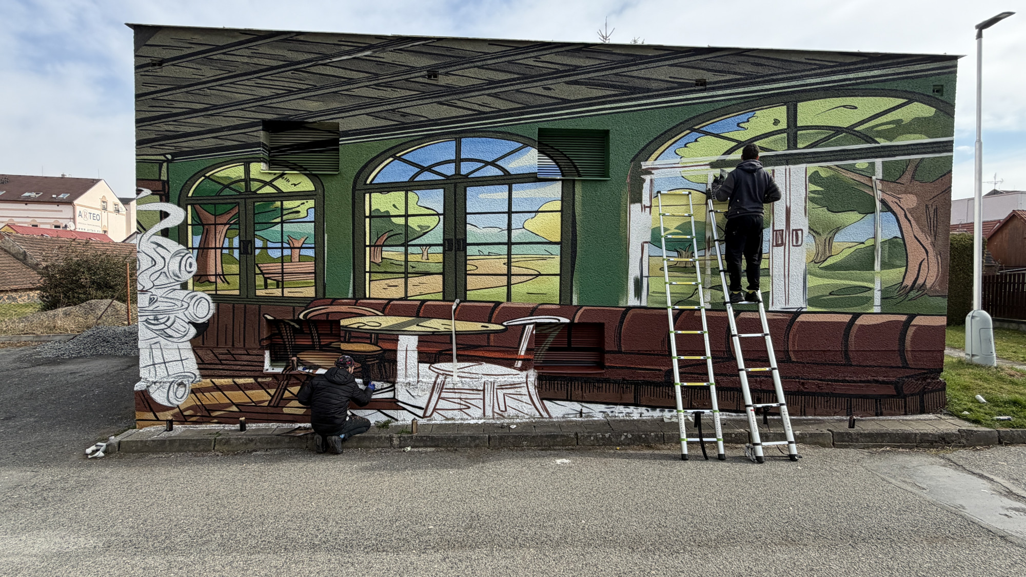 Na fasádě trafostanici vytvořili umělci kavárnu s výhledem do přírody a robotickou servírkou