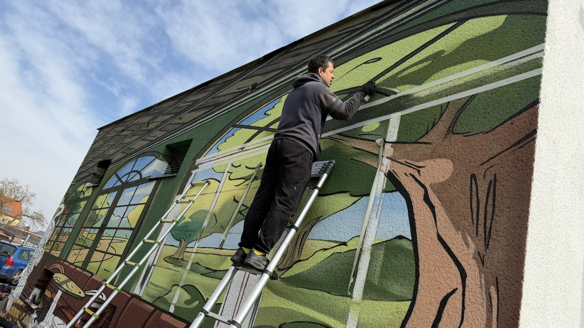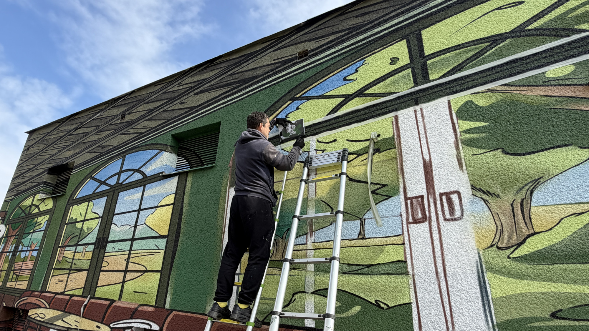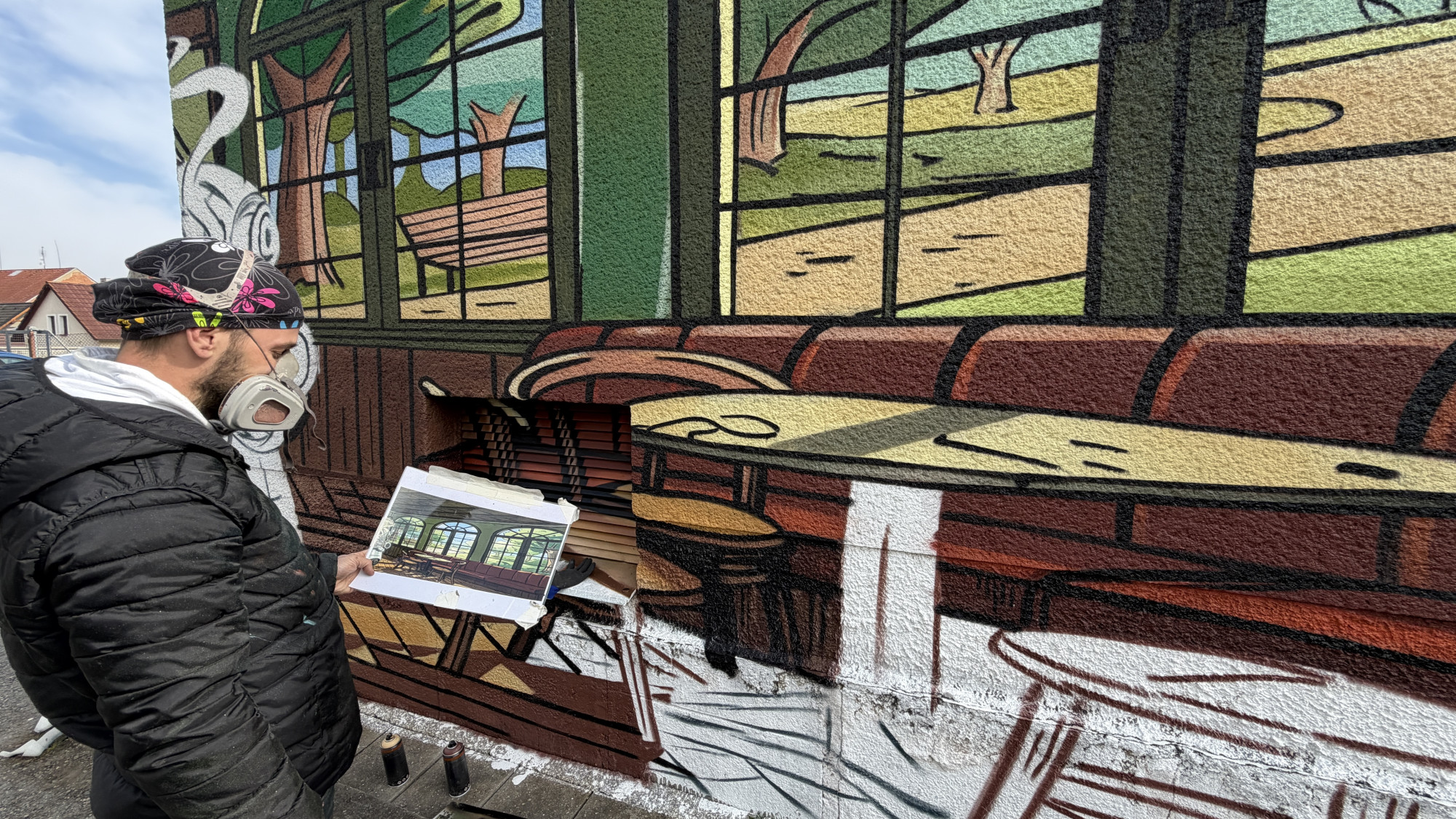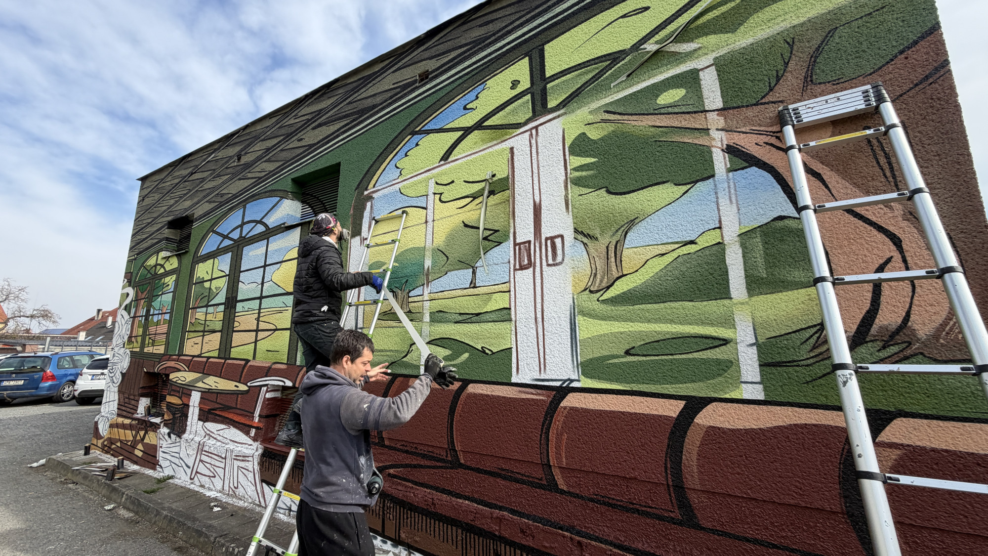 Na fasádě trafostanici vytvořili umělci kavárnu s výhledem do přírody a robotickou servírkou
