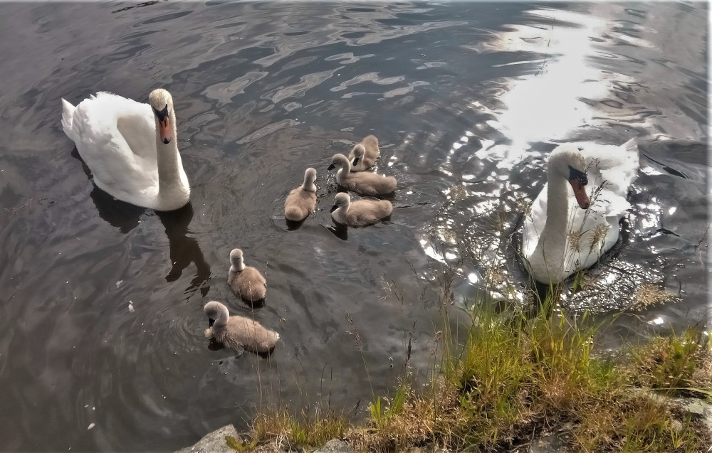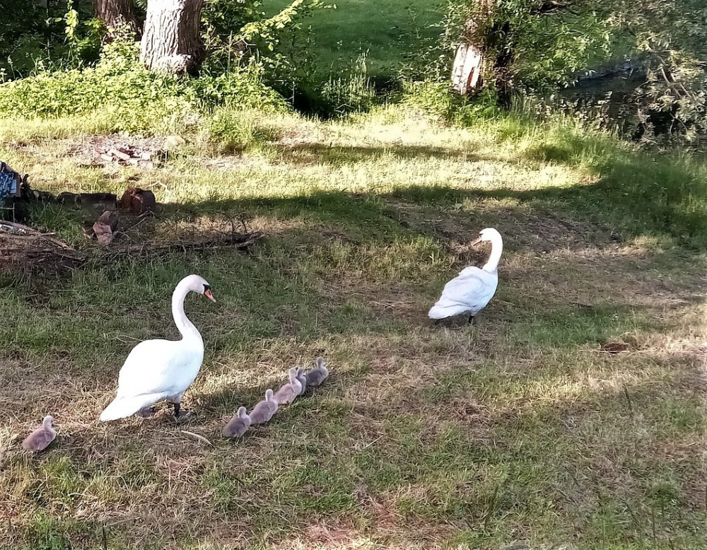 Labutí rodinka v celé své kráse i se svým ochráncem s jedním křídlem
