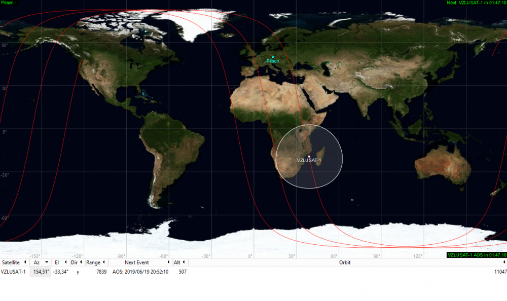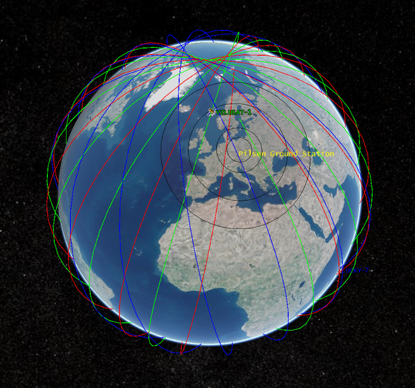 Animace dráhy satelitů VZLUSAT-1 nad komunikační stanicí v Plzni