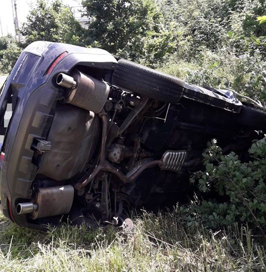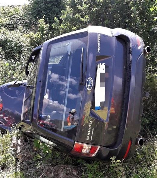 Vozidlo značky Subaru skončilo po nárazu mimo silnici převrácené na boku