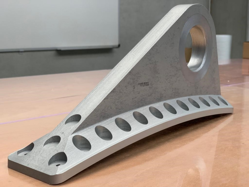 Detail montážního kloubu. Jedná se o jeden z kritických dílů zajišťujících přenos zatížení z centrálního stupně na postranní urychlující motory