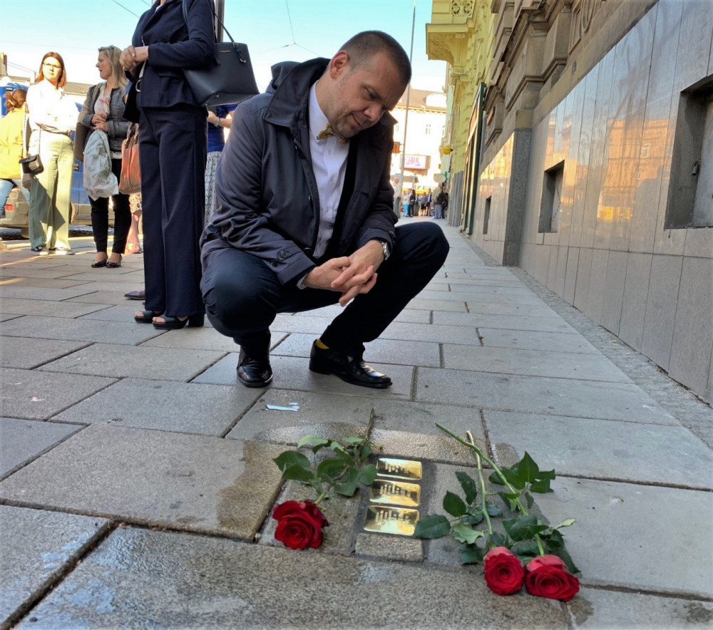 Primátor Plzně Martin Baxa u čerstvě vsazených kamenů zmizelých