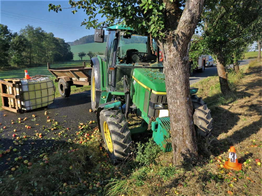 Traktor se na úzké vozovce vyhýbal jinému vozidlu a skončilo to nárazem do jabloně