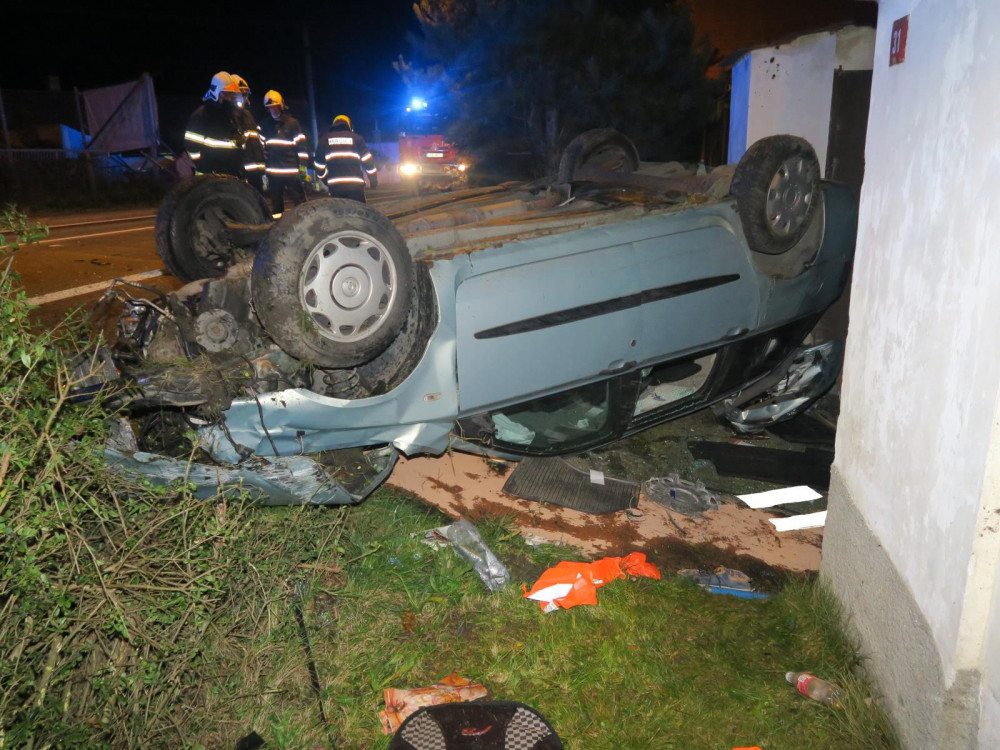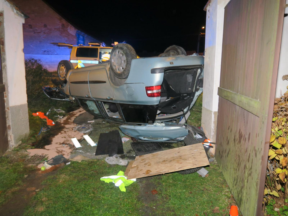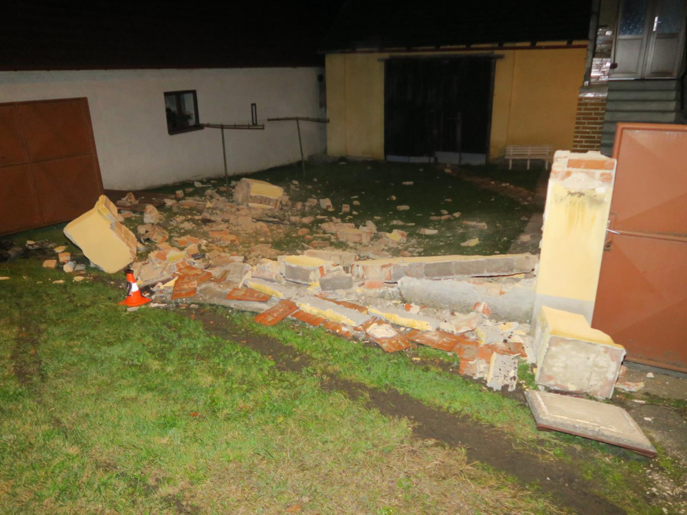 Auto zbořilo hradbu a přistálo na střeše ve vjezdu dalšího domu, řidič od nehody ujel jiným vozem