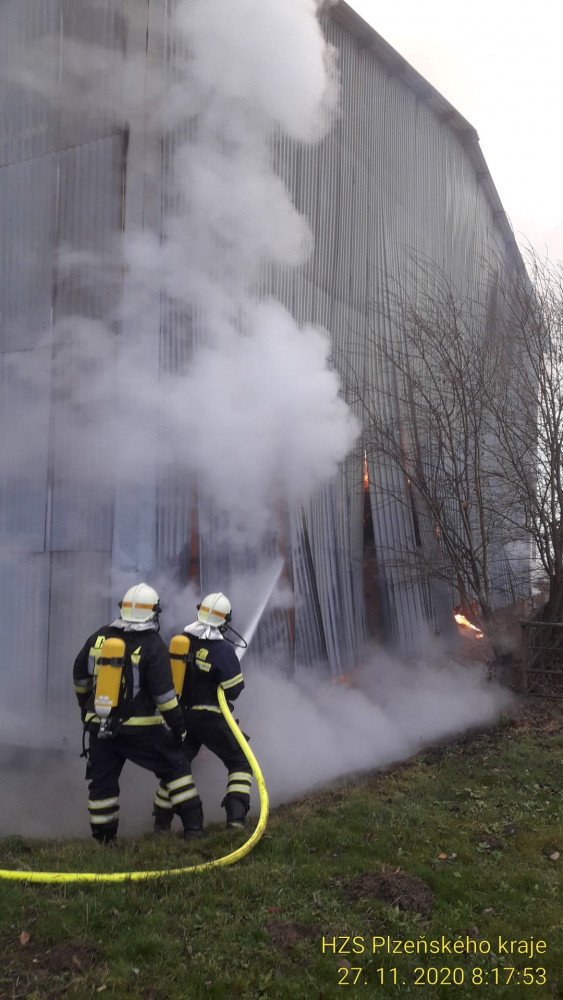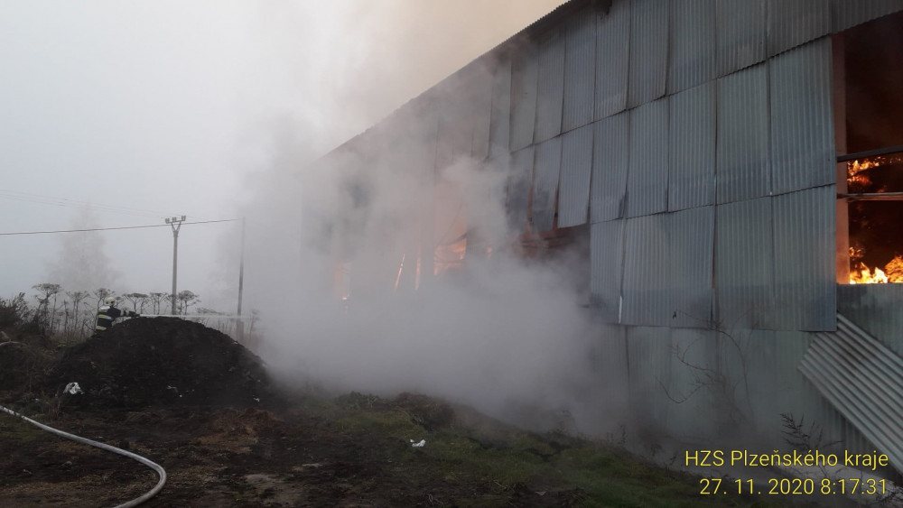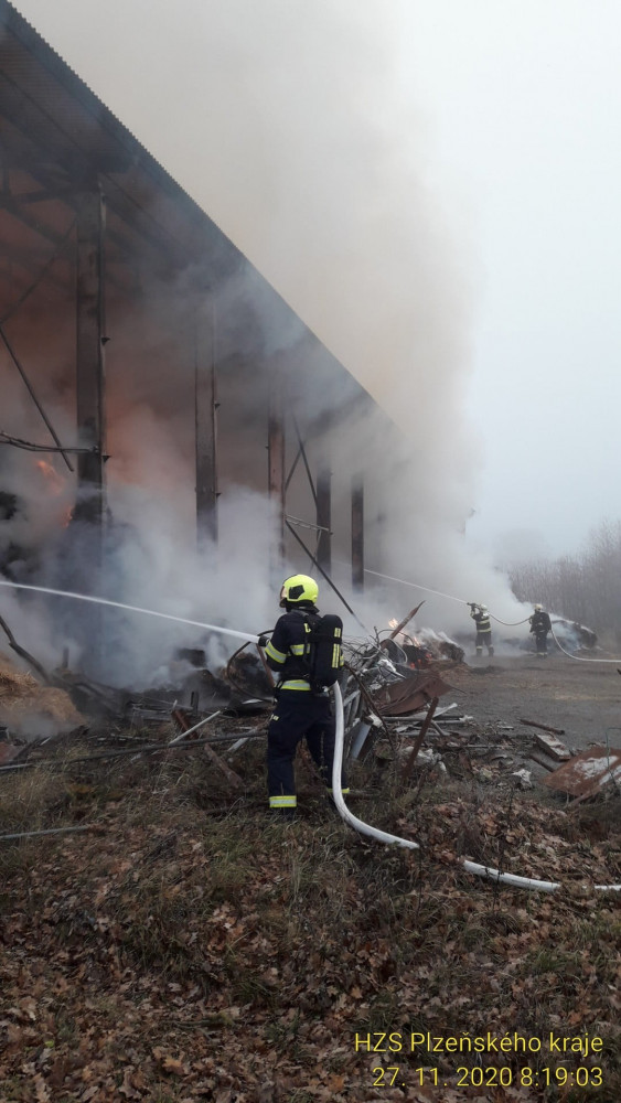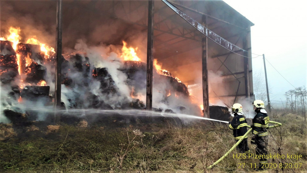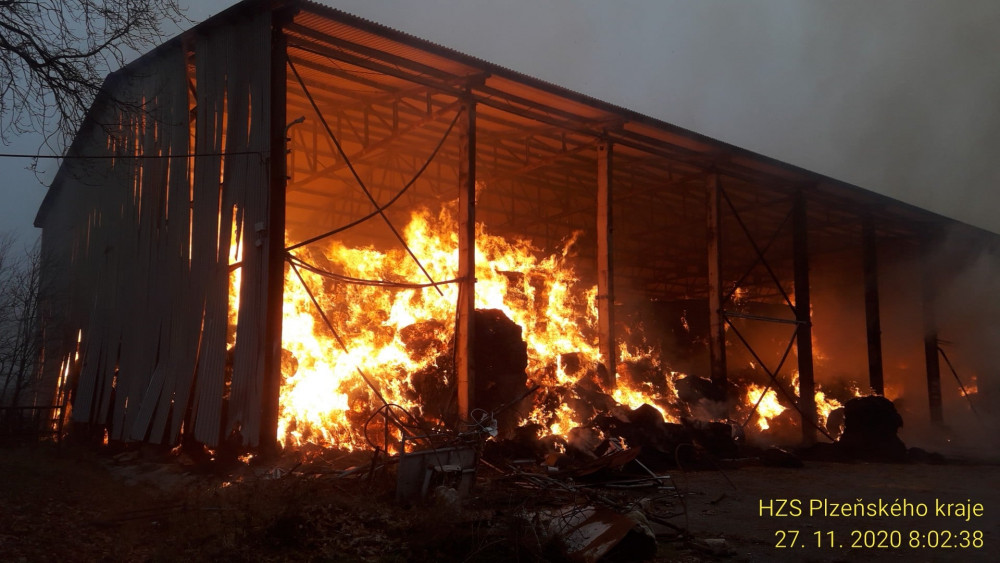 Hasiči likvidují na Tachovsku požár velké skladovací haly, uvnitř hoří balíky sena