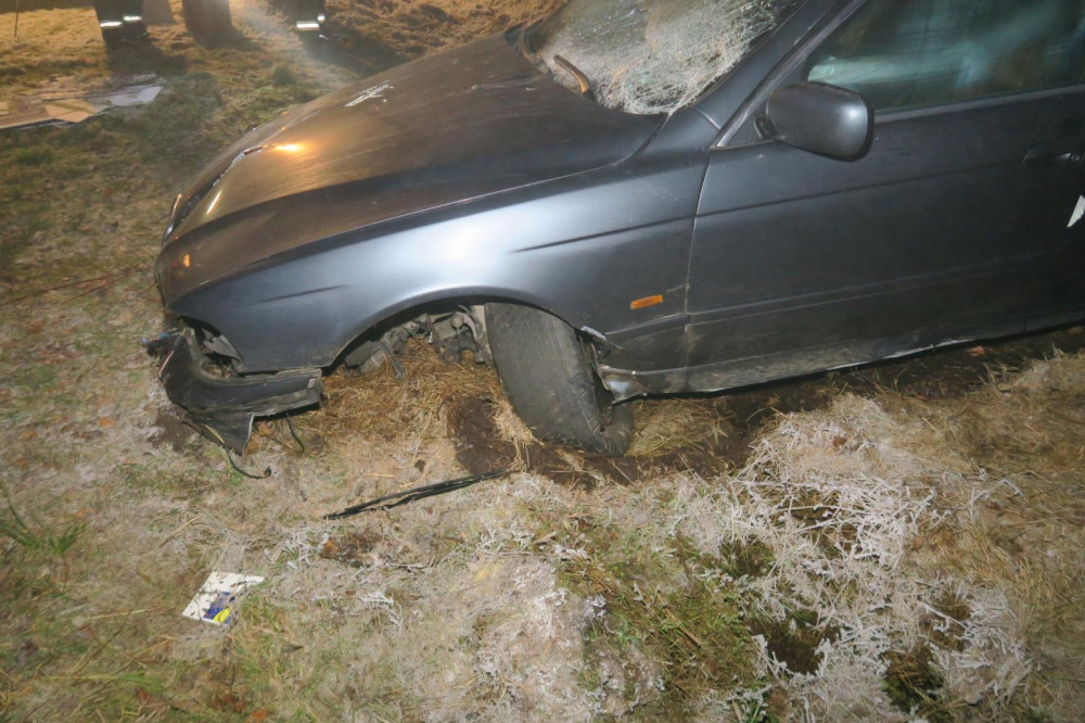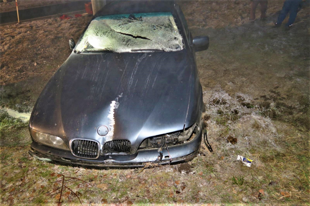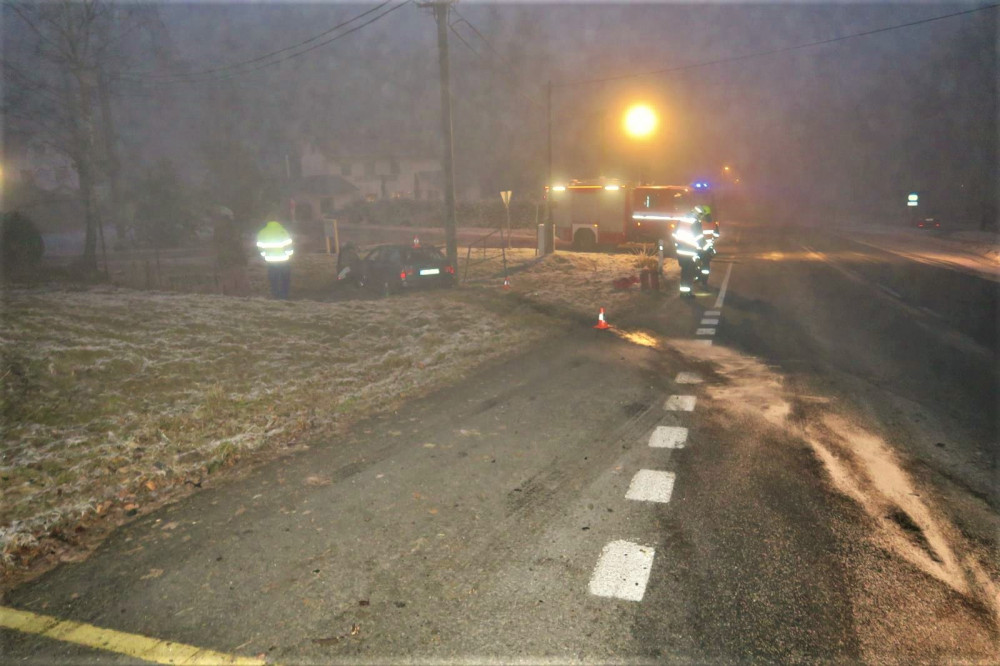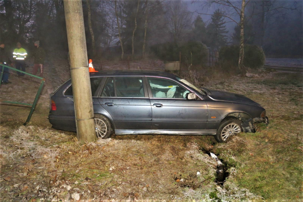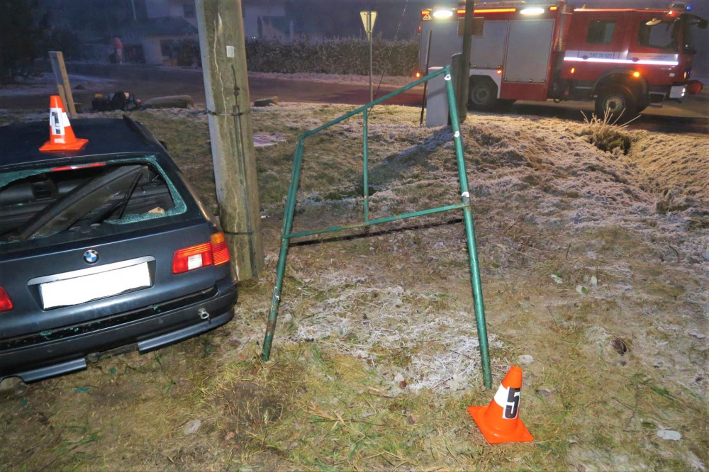 Řidič BMW po smyku na namrzlé silnici smetl dopravní značky i reklamní tabuli