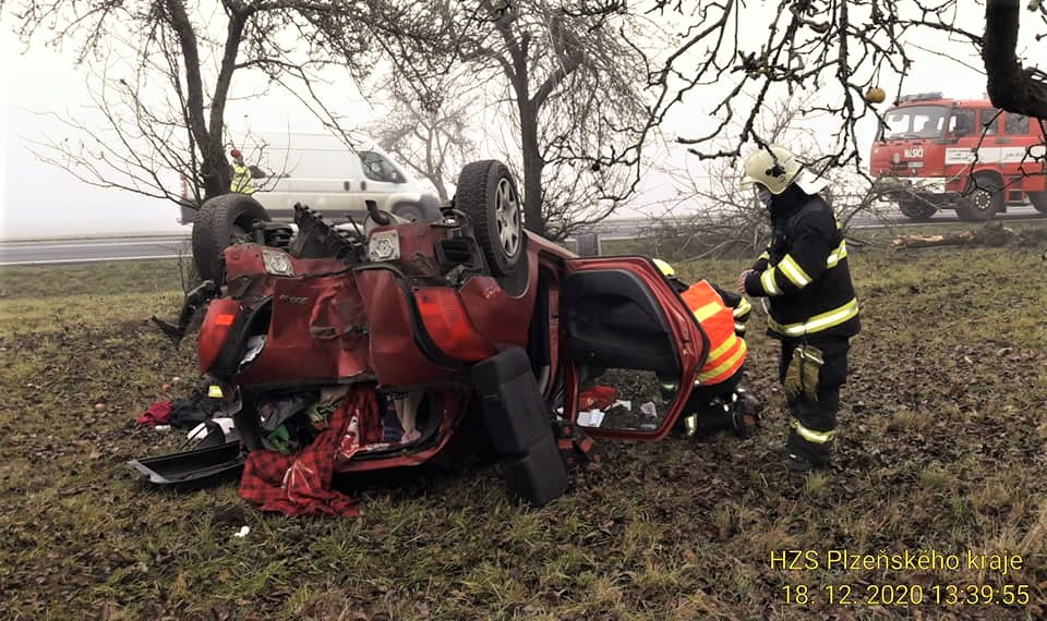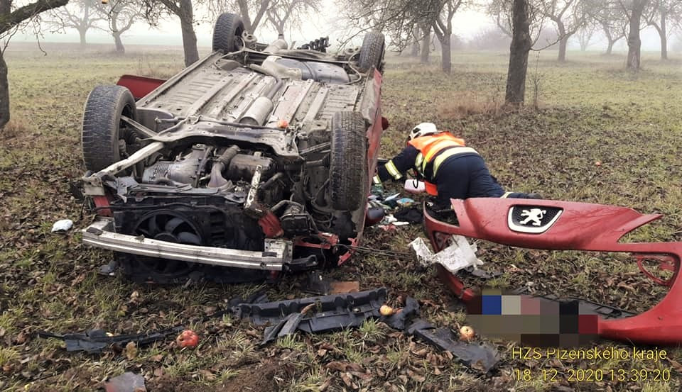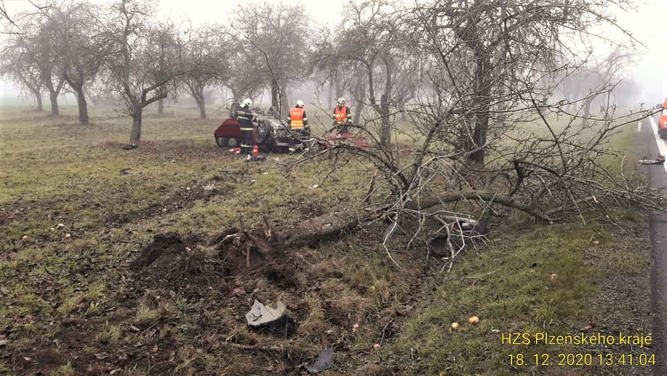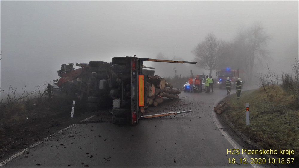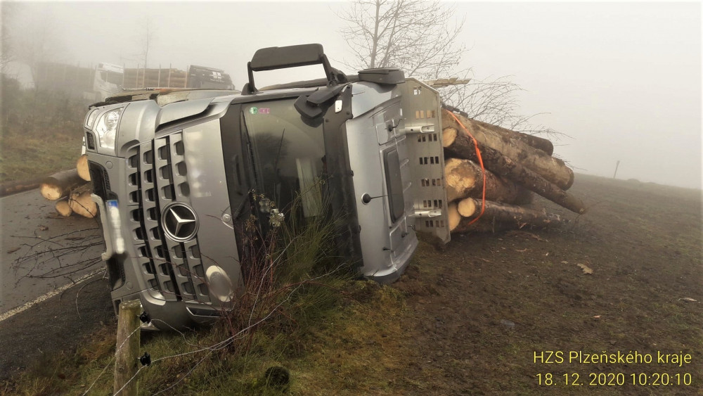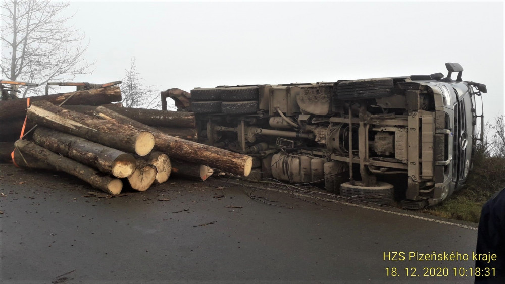 Kamion se převrátil a vysypal náklad dřeva, řidička osobáku zase vyvrátila strom a skončila na střeše v jabloňovém sadu