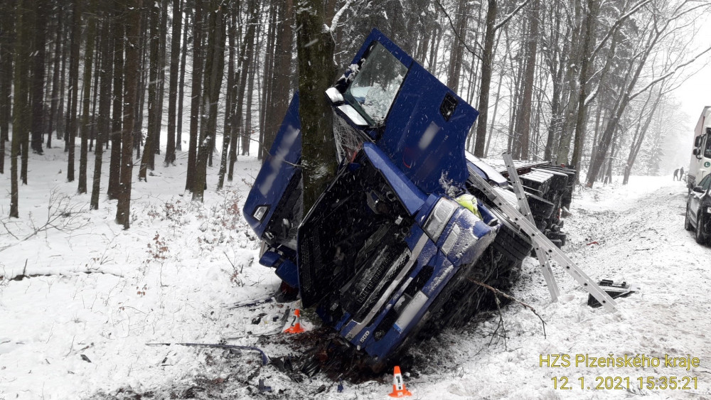 Kvůli nehodě tohoto kamionu bude dnes uzavřena doprava v okolí Babylonu na Domažlicku