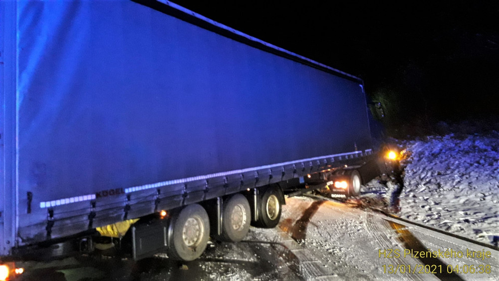 Silnice uzavřené kvůli sněhu a nehoda náklaďáku na D5, taková je dnes situace v kraji