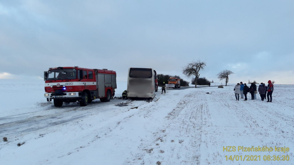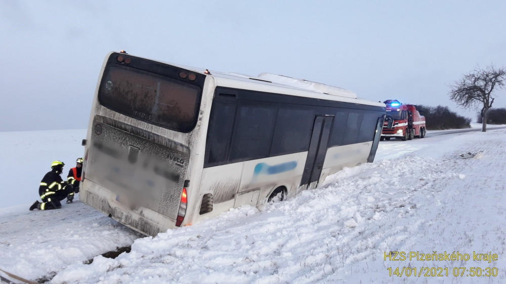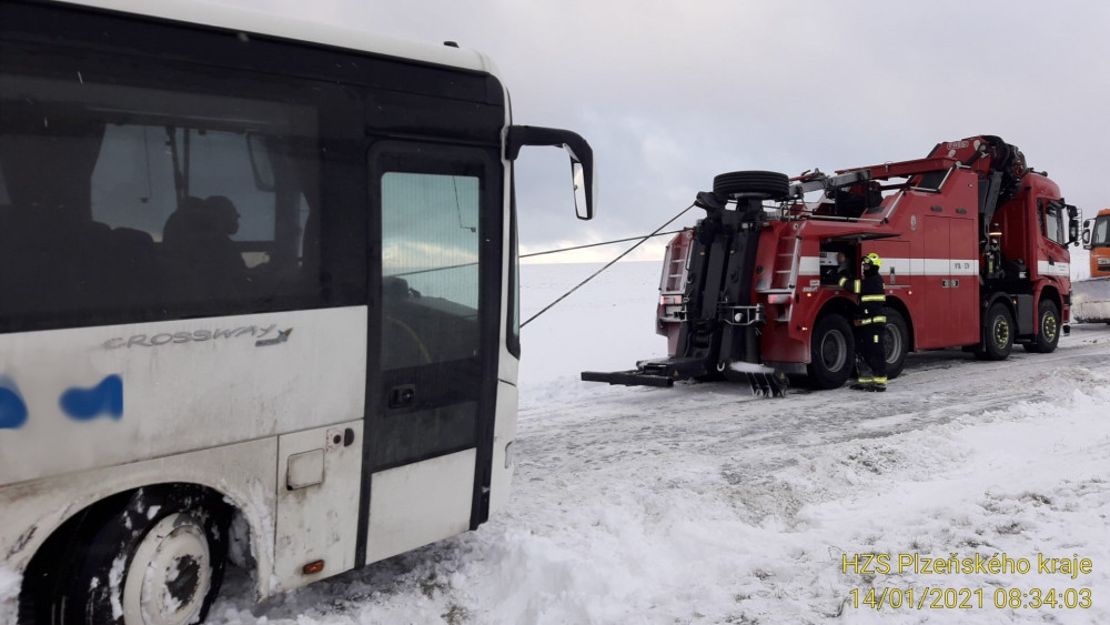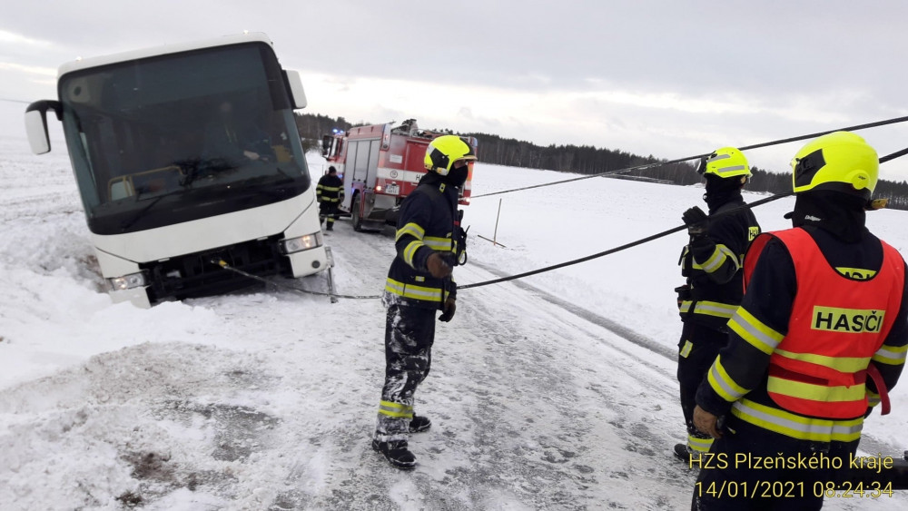 Hasiči vyprošťovali autobus, který sjel na severním Plzeňsku ze silnice a uvízl v závěji
