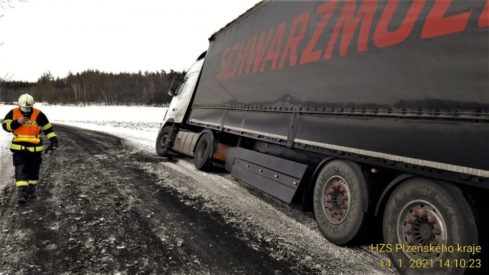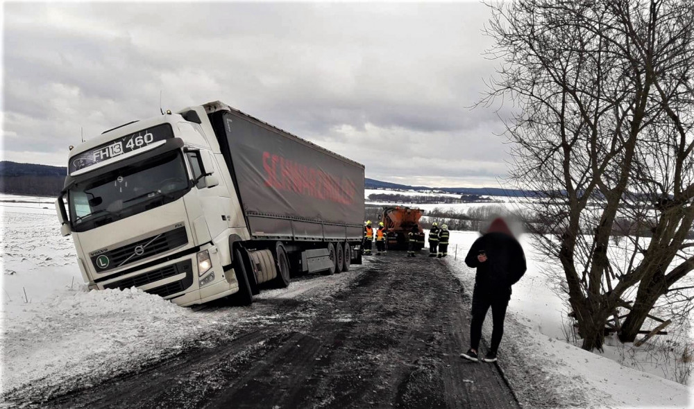 Zapadlý kamion vyprošťovali dnes hasiči také u Kařízku