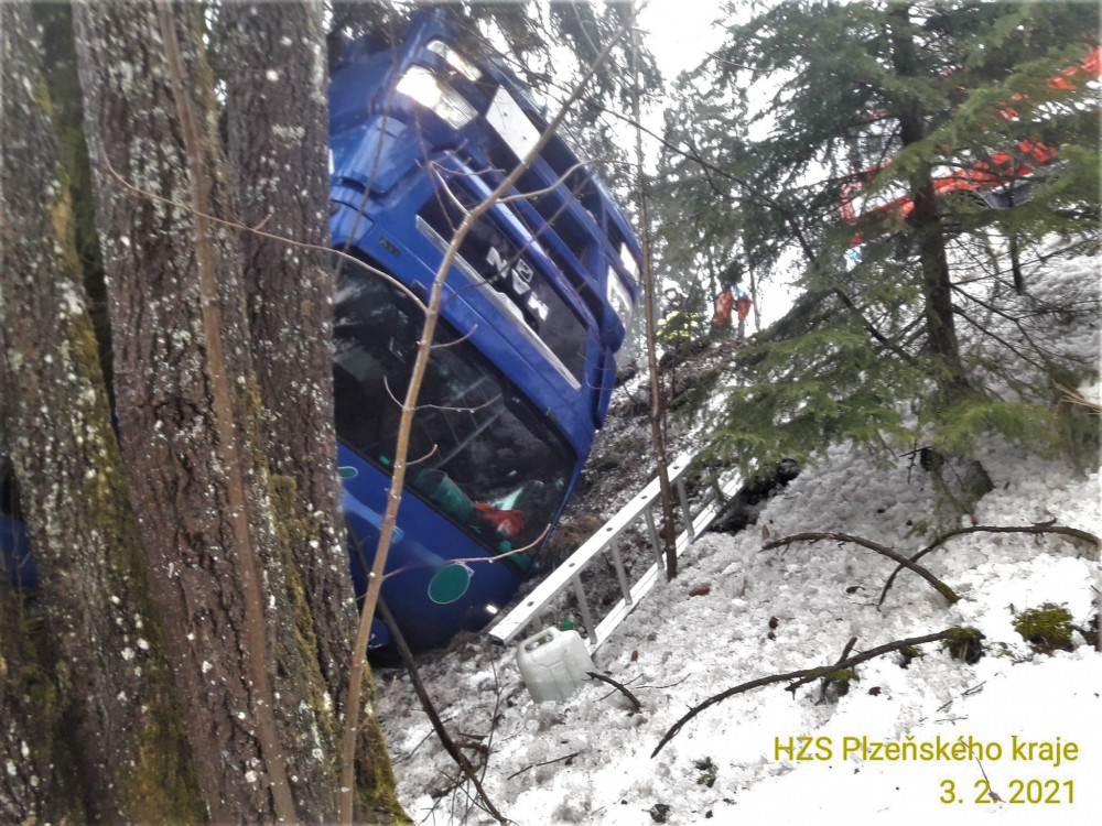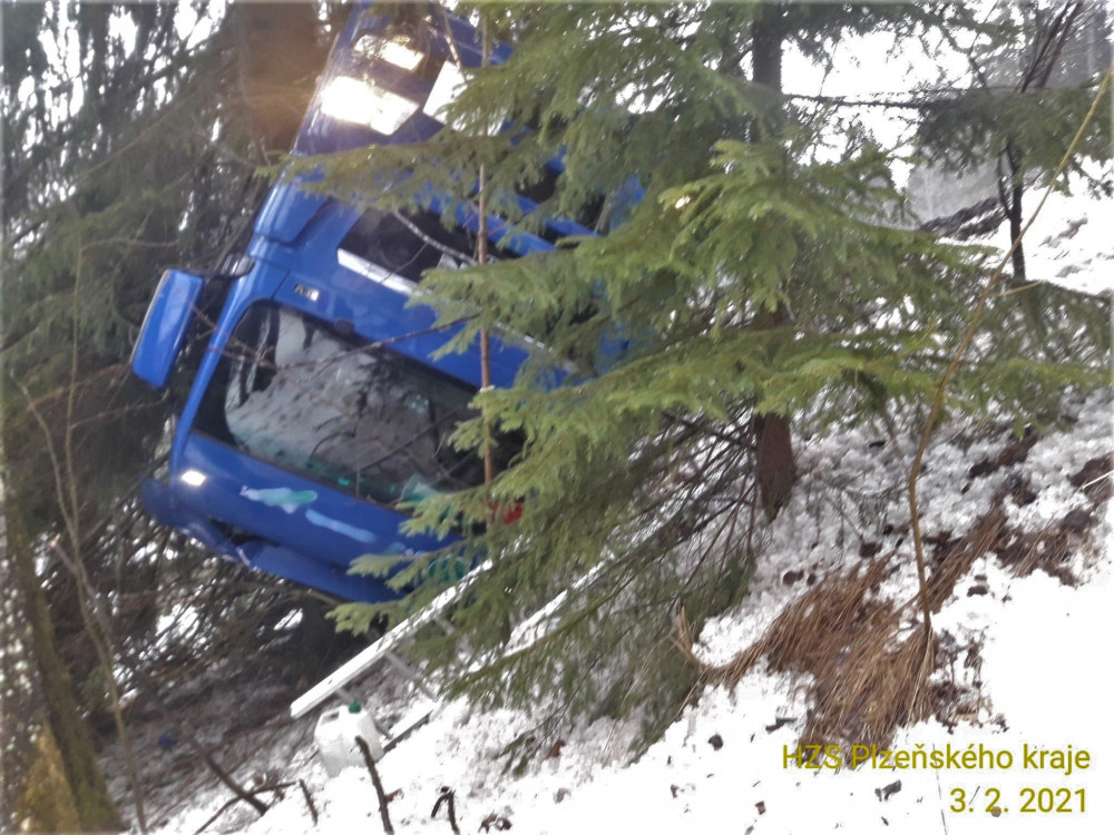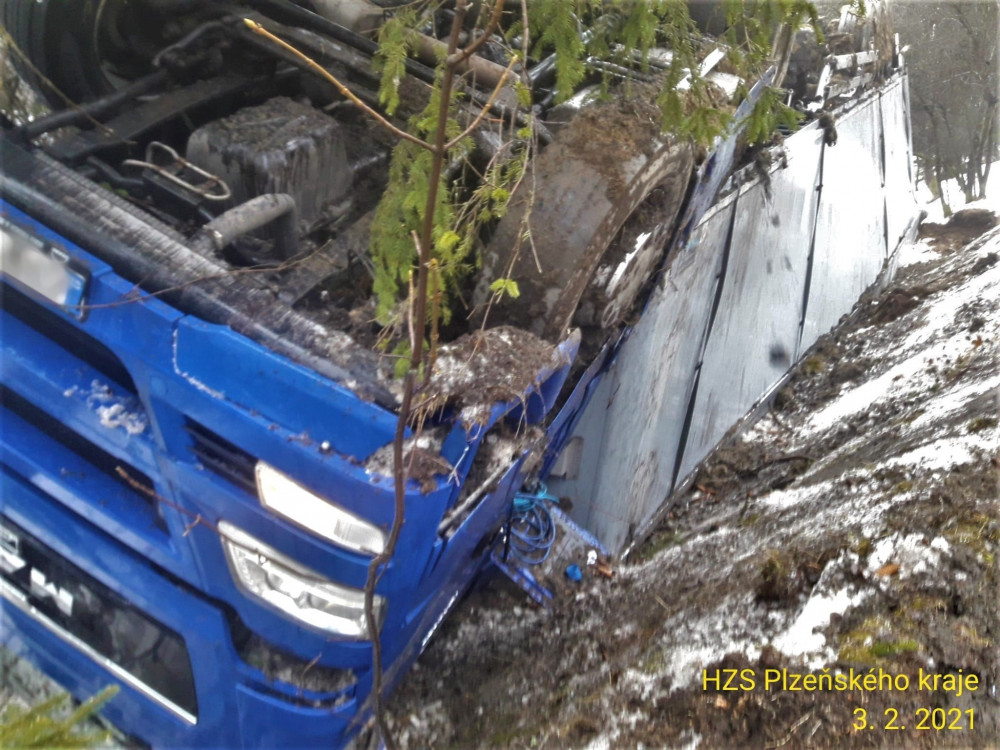 Kamion se u Železné Rudy zřítil ze srázu a zůstal převrácený na střeše