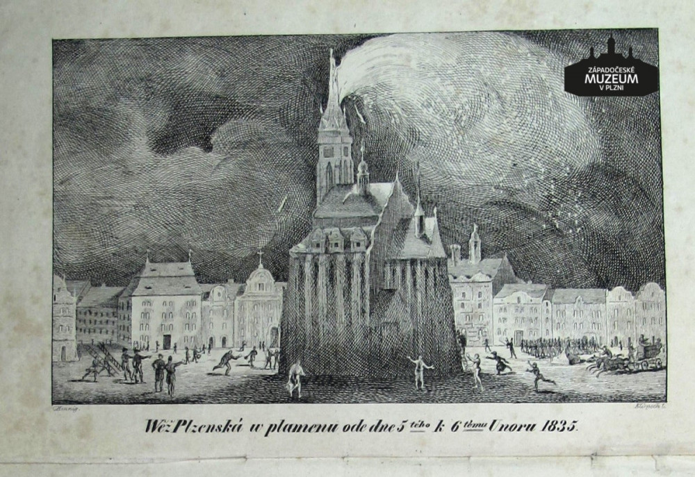 Ilustrace z titulního listu pamětní publikace Věž plzeňská v plamenech
