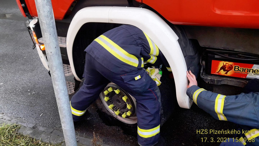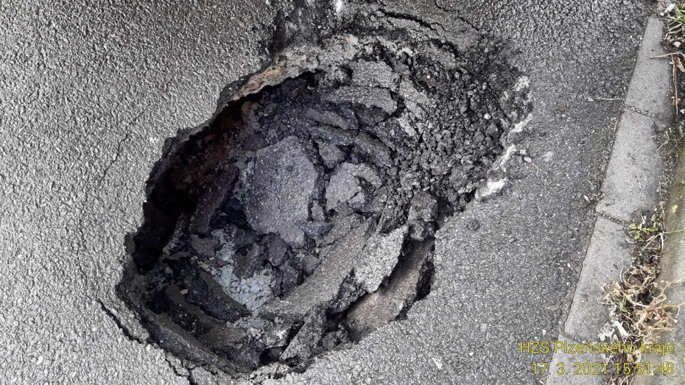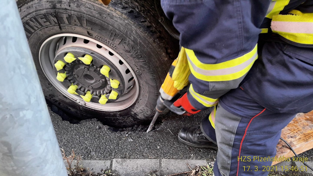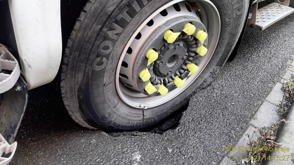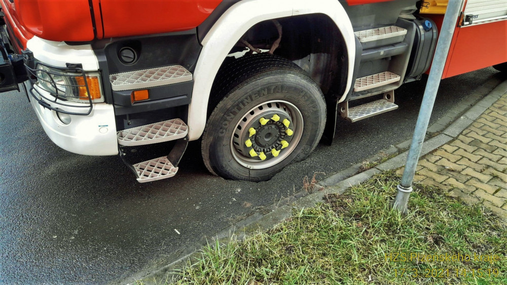 Pod hasičskou cisternou se cestou k zásahu nebezpečně propadla vozovka