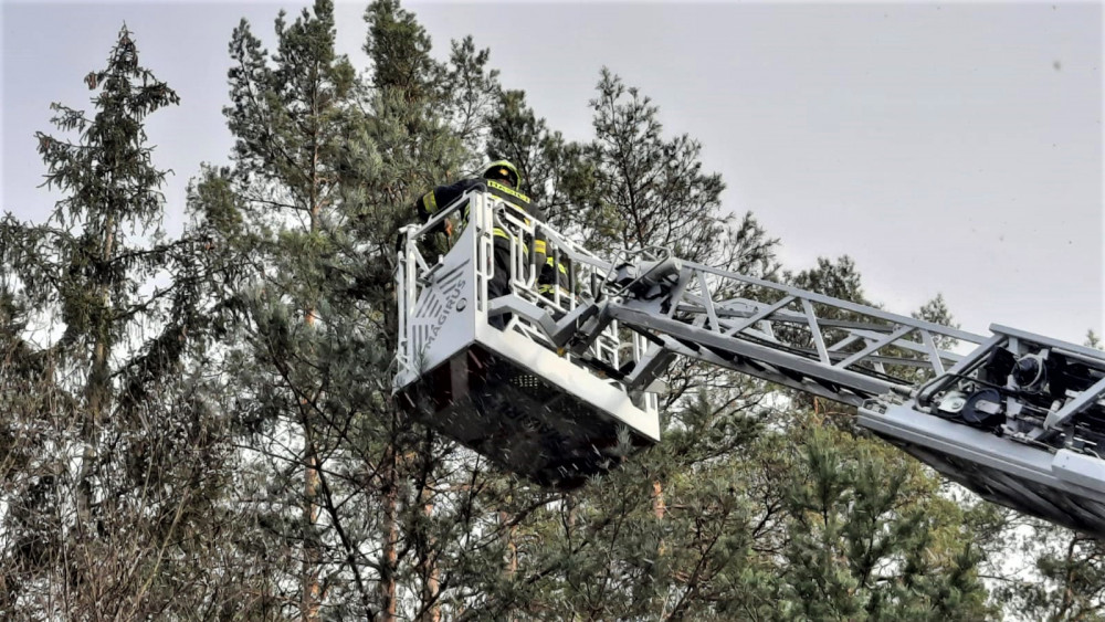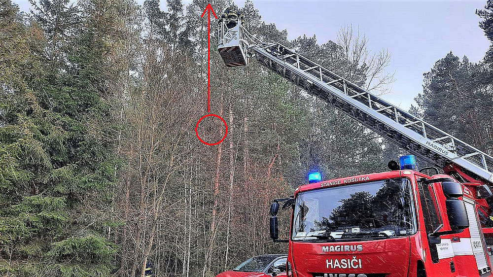 Hasiči neváhali použít výsuvnou plošinu, aby zachránili kočku z vysokého stromu