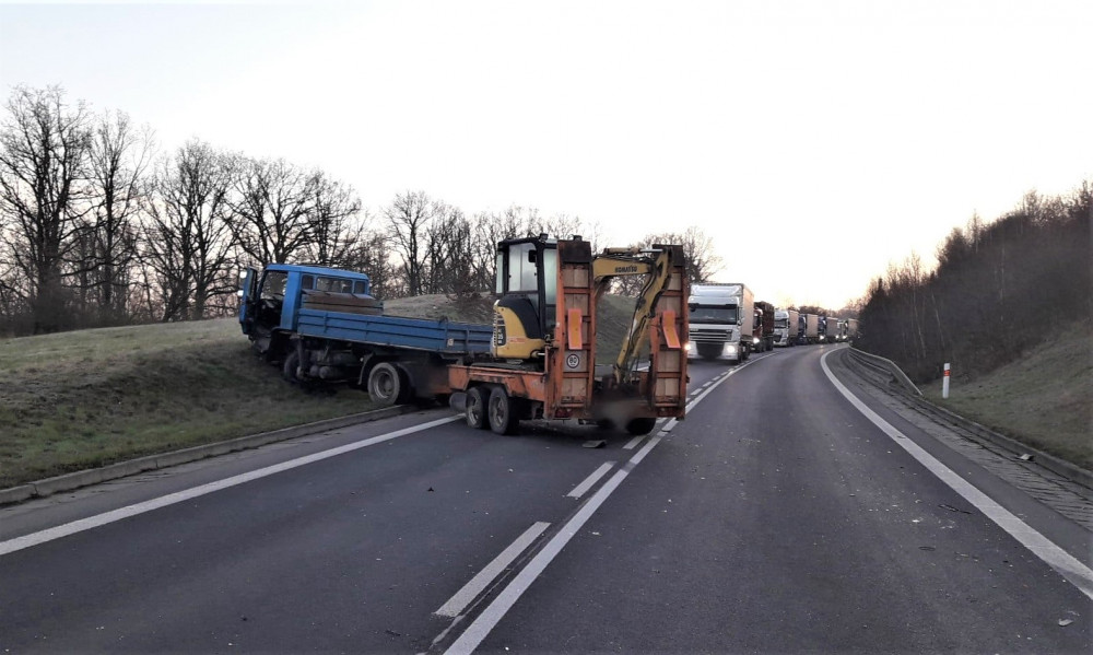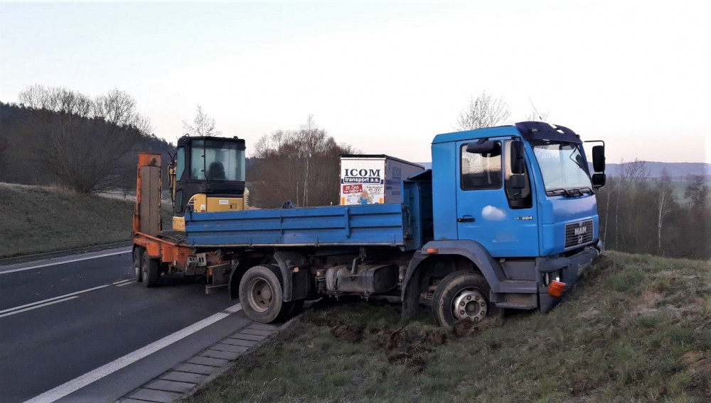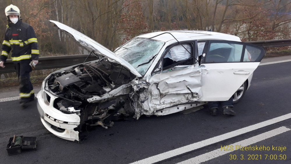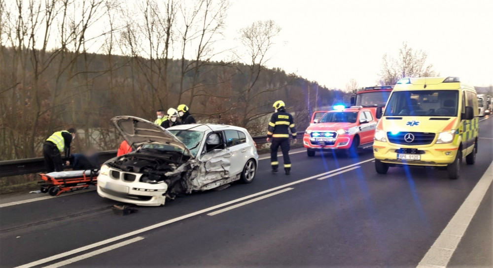 Řidič BMW přejel do protisměru a srazil se s náklaďákem převážejícím stavební stroj
