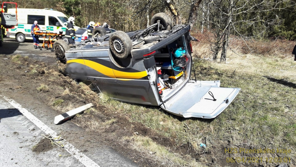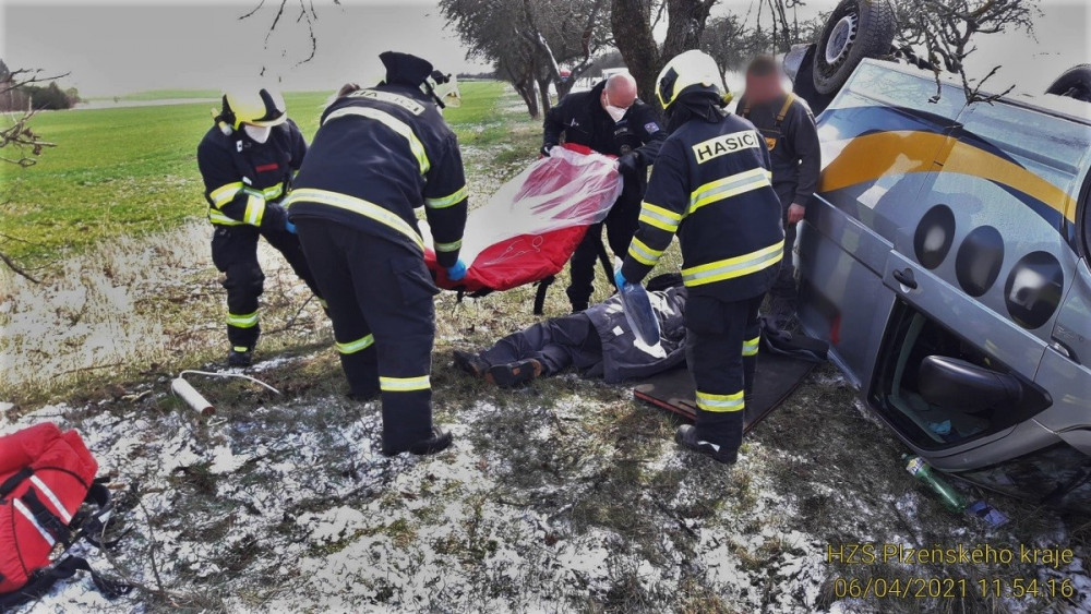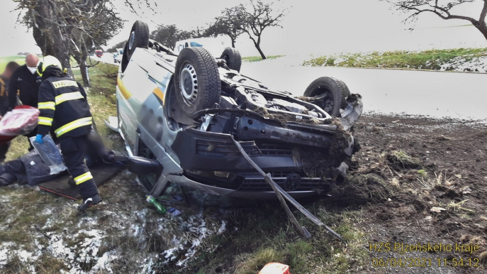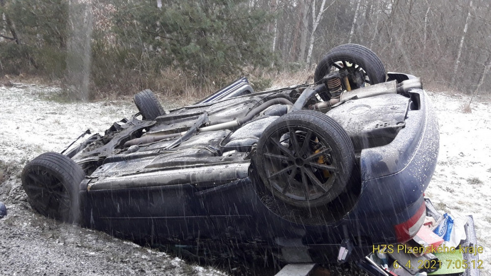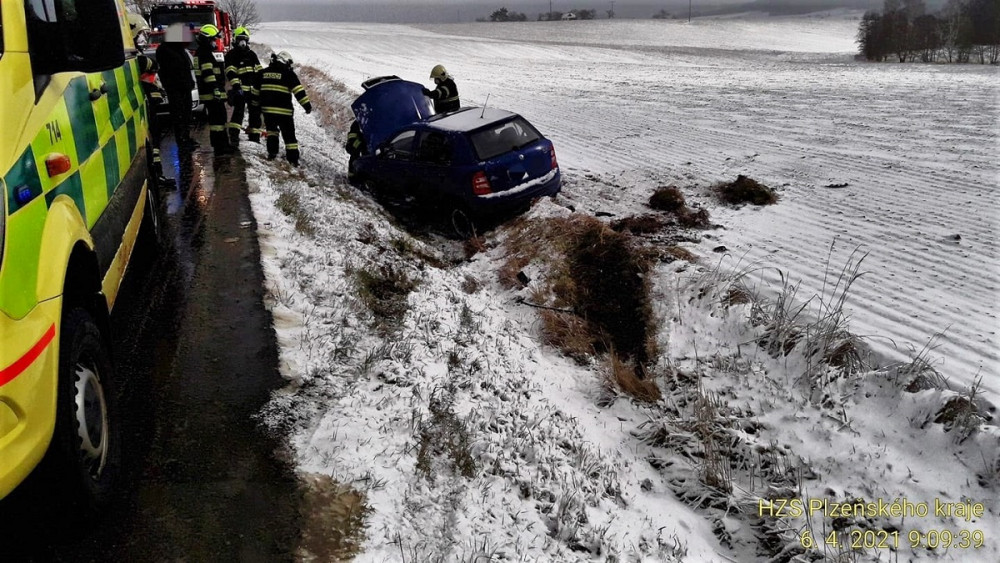 Namrzlé silnice potrápily řidiče v Plzeňském kraji, jeden muž skončil s vozem na střeše
