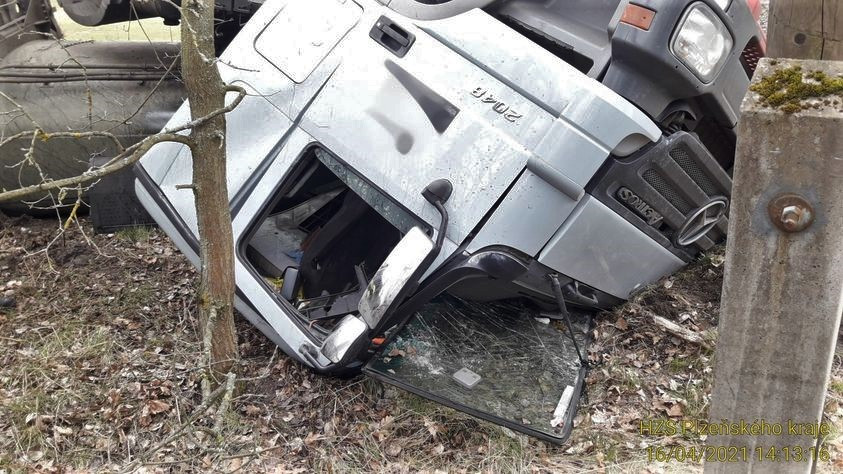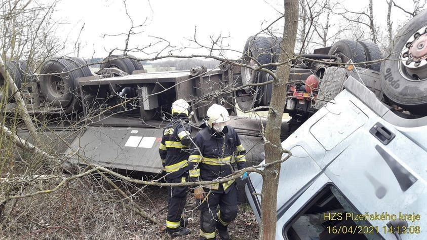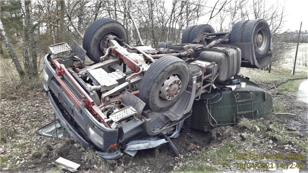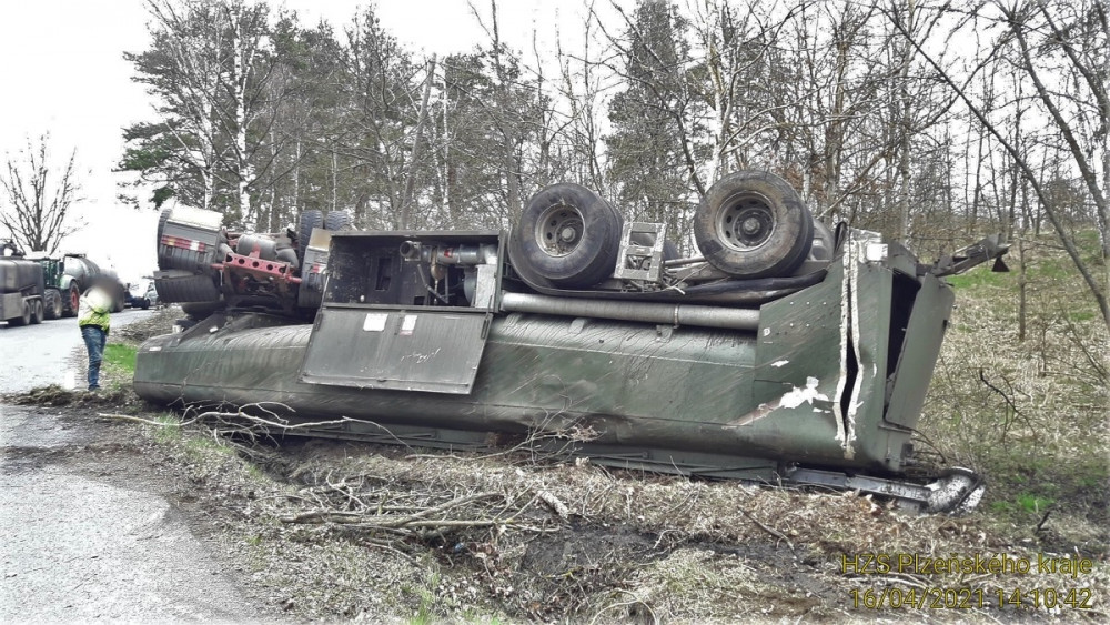 Řidič převrátil cisternu s močůvkou do příkopu, hasiči na místě jímají unikající palivo
