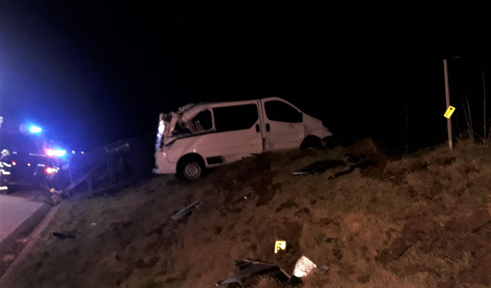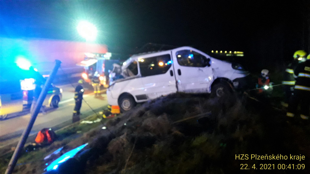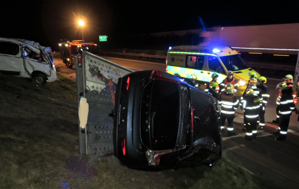 Vážná nehoda cizinců na dálnici D5, havarovali s dodávkou převážející na vleku auto