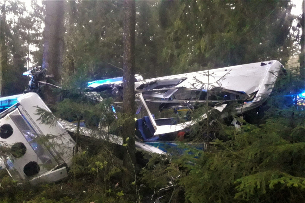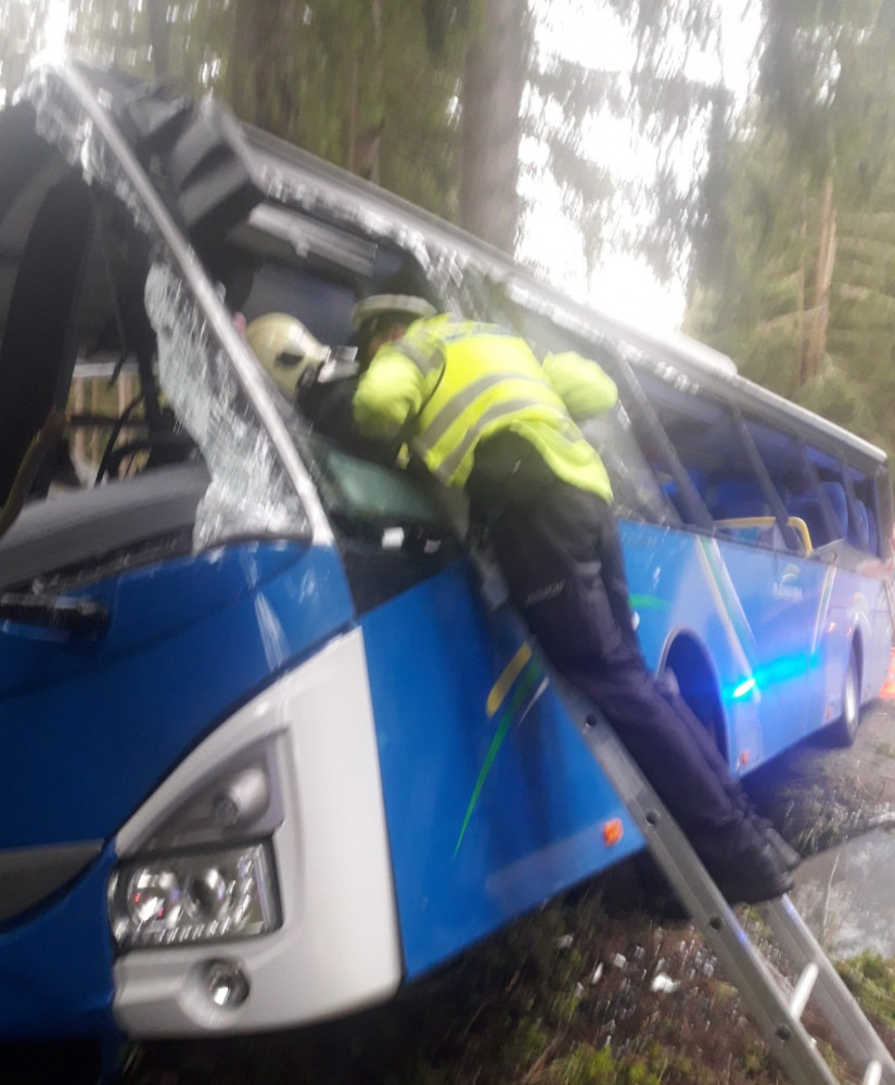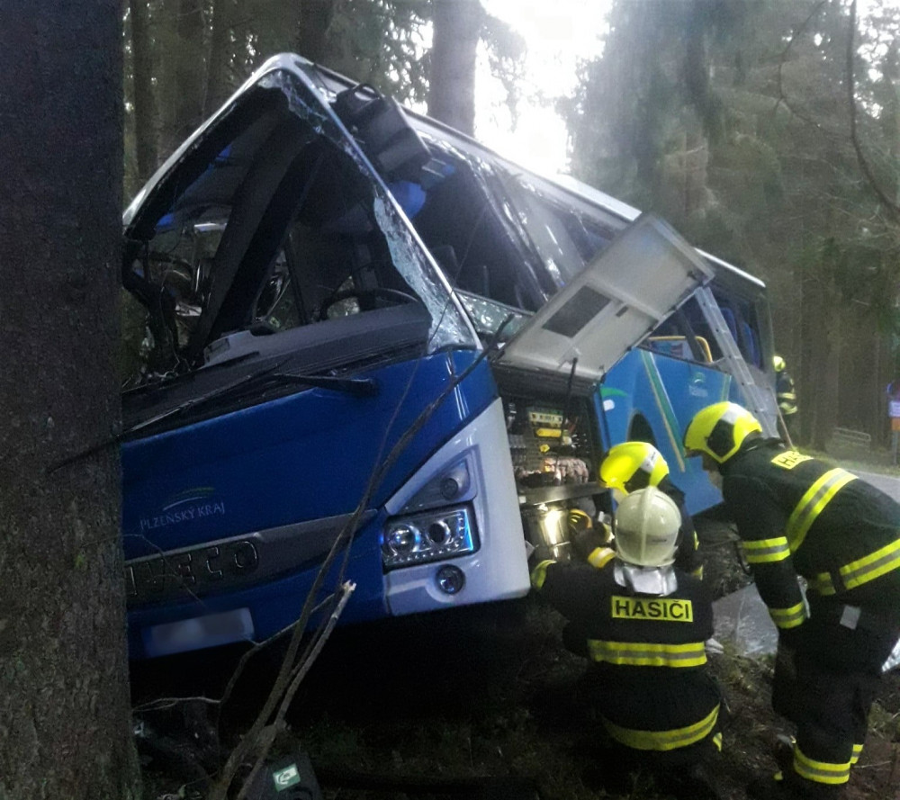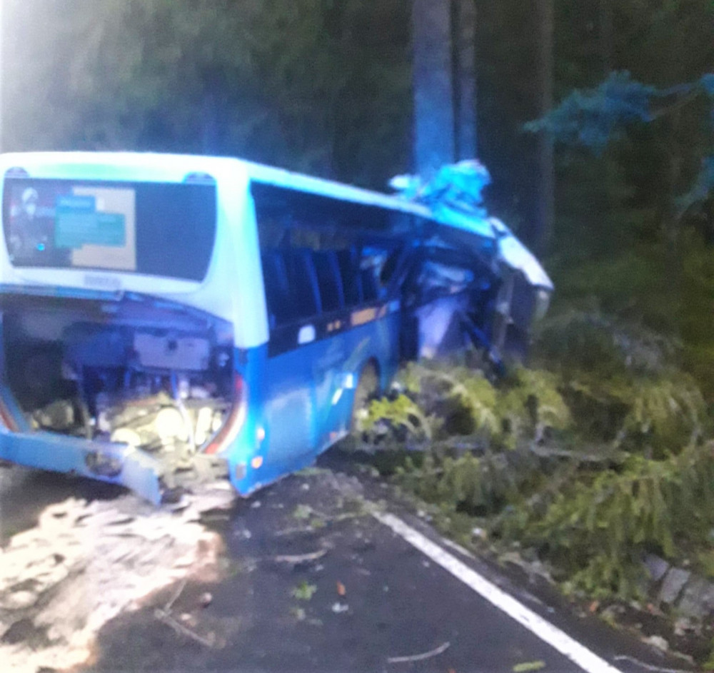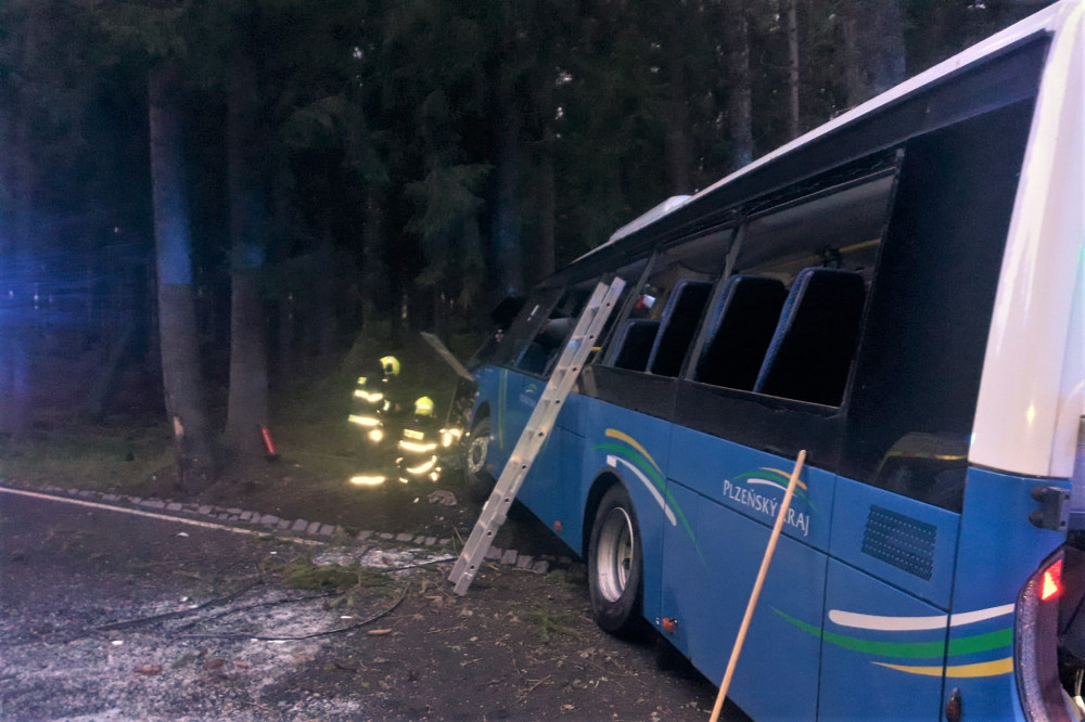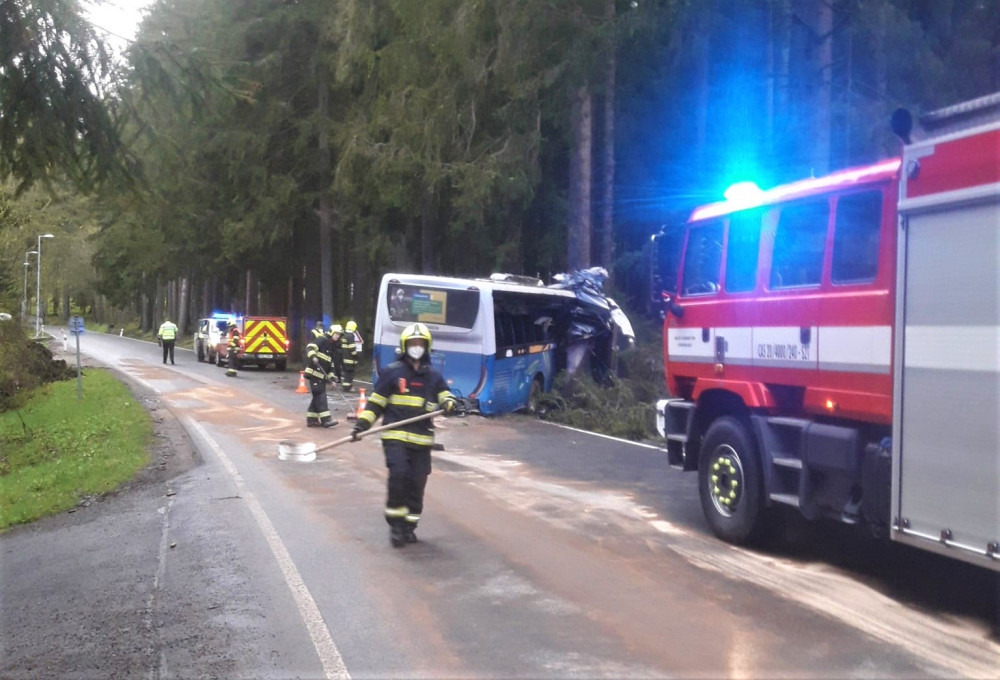 Autobus na Šumavském Špičáku vyjel ze silnice a roztříštil se o stromy