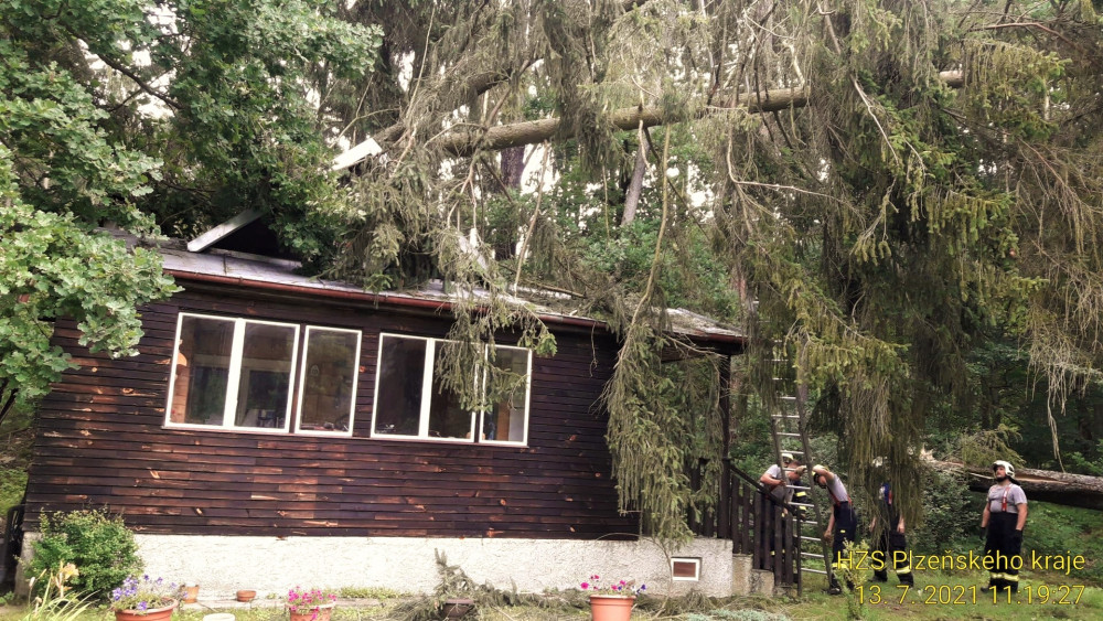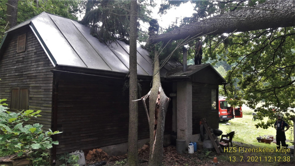 Z této chaty odstraňovali hasiči ještě dnes dva padlé stromy