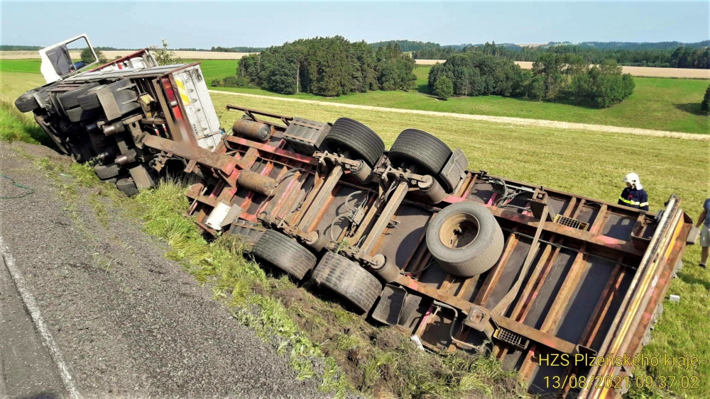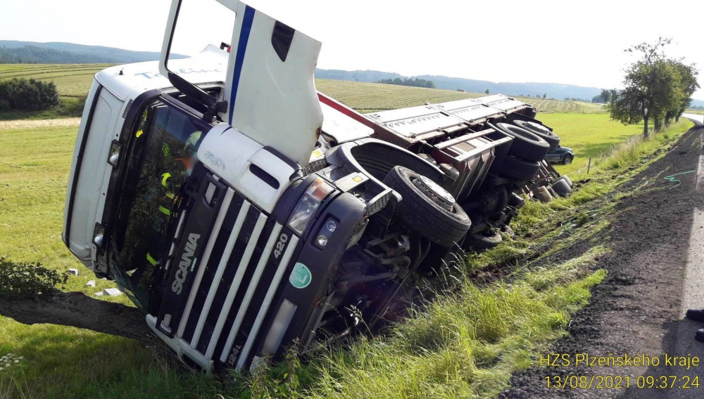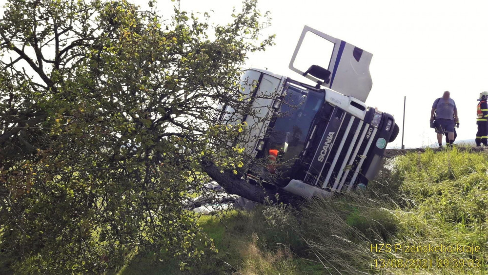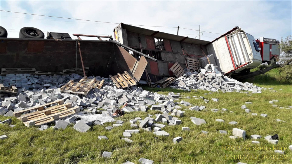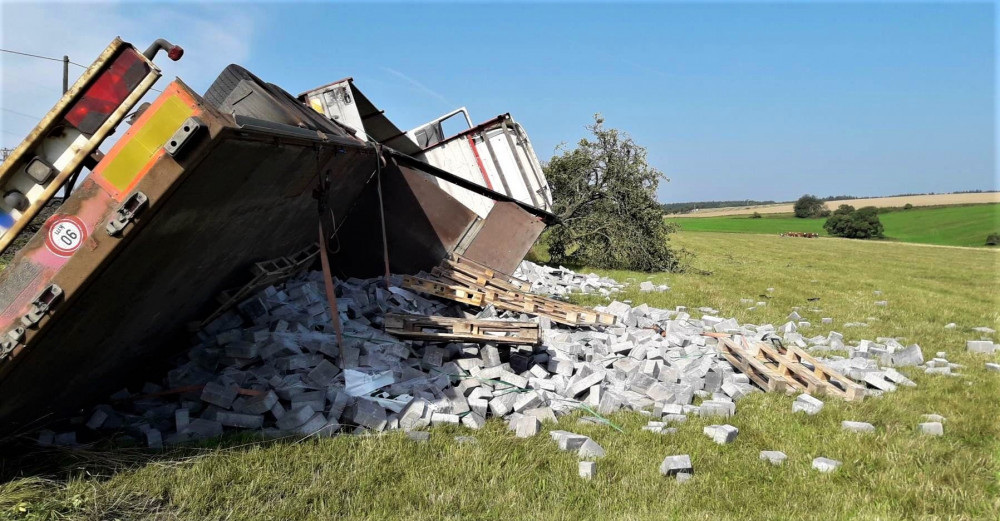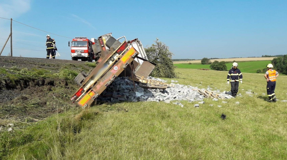 Auto najelo na nezpevněnou krajnici a zřítilo se za svahu, naložený stavební materiál se vsypal