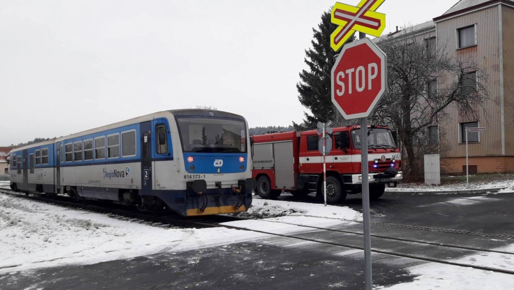 Řidič na kluzké vozovce před nechráněným železničním přejezdem nedobrzdil dodávku a narazil do vlaku