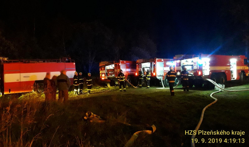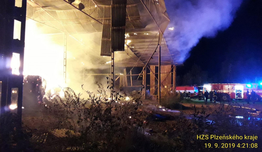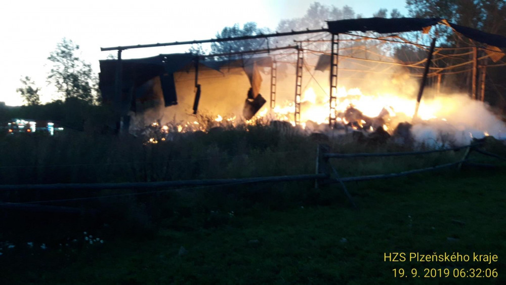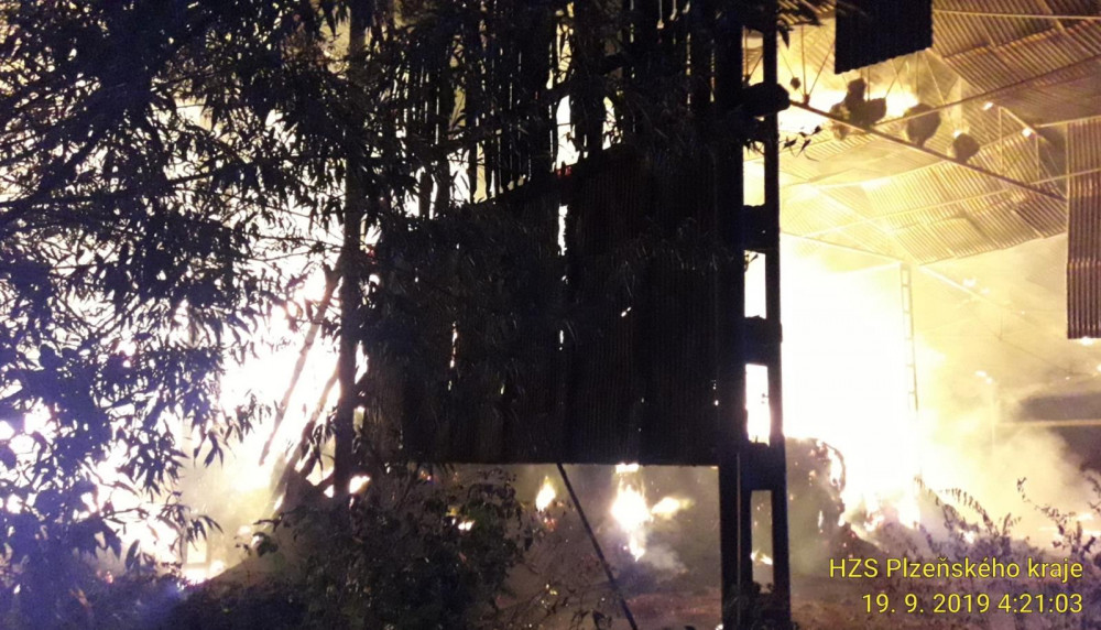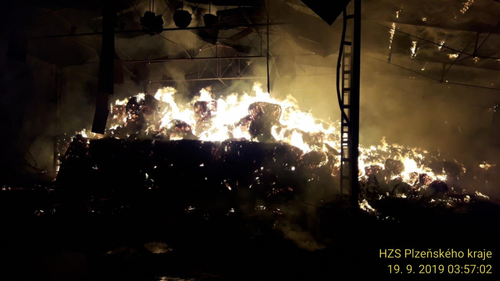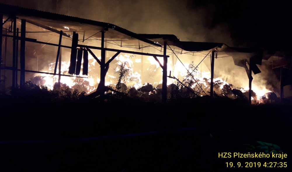 Požár skladu slámy na Plzeňsku zničil 1000 balíků slámy.