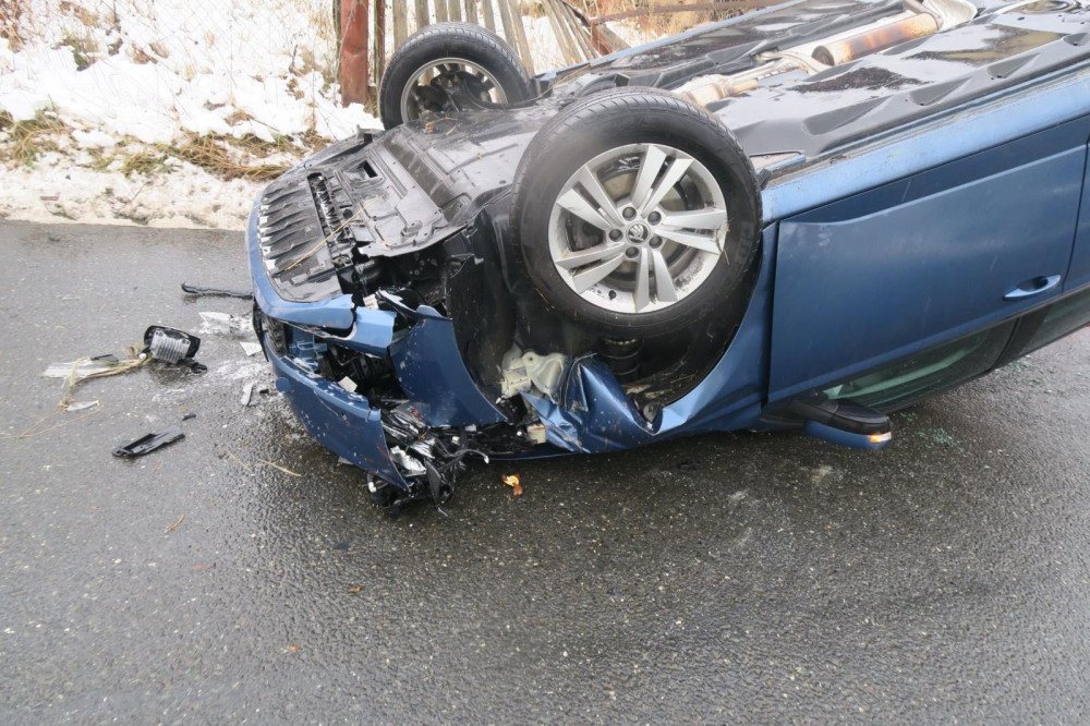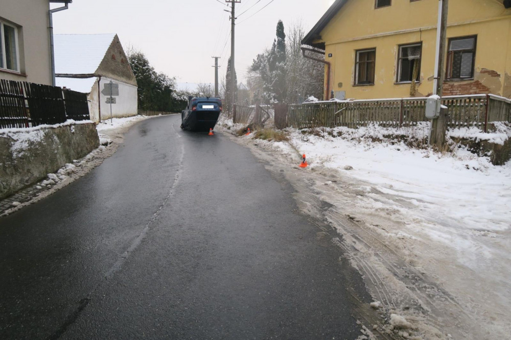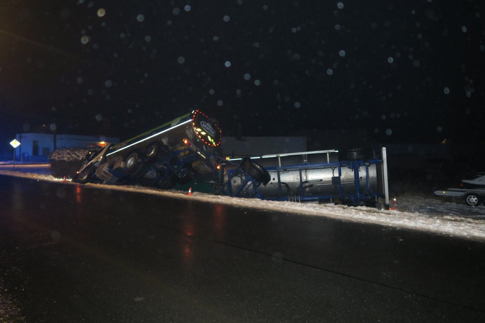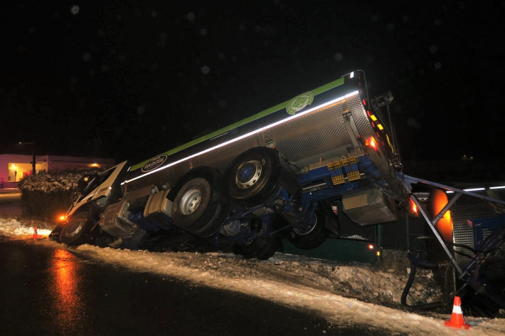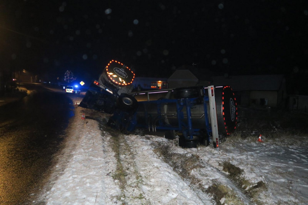 Řidič cisterny nezvládl jízdu po zledovatělé silnici a skončil v příkopu