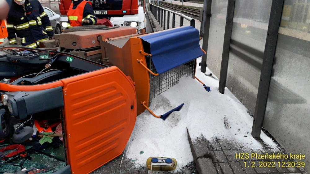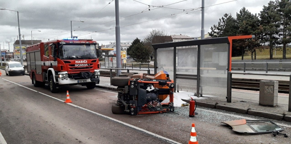 U tramvajové zastávky se převrátil malý sypač, řidič skončil v nemocnici