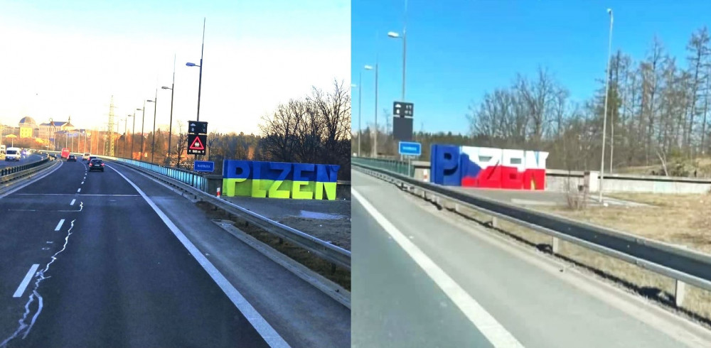Sprejeři nastříkali nápis PLZEŇ ukrajinskými barvami, po kritice ho někdo předělal na českou verzi