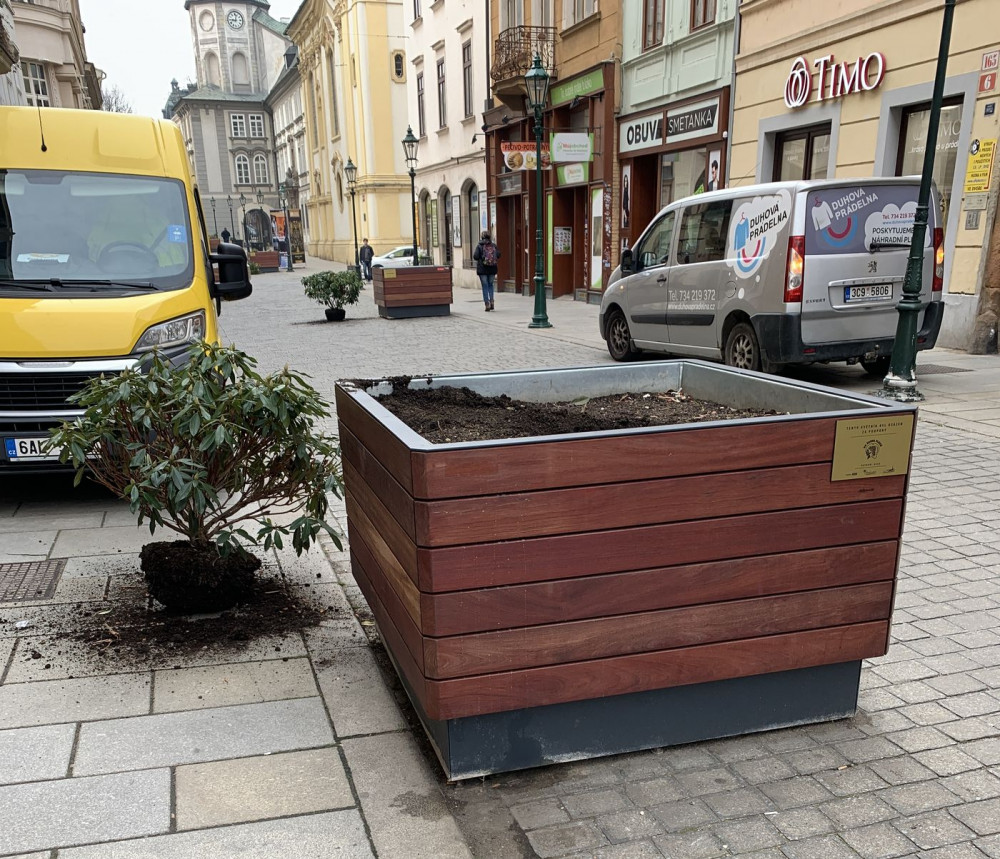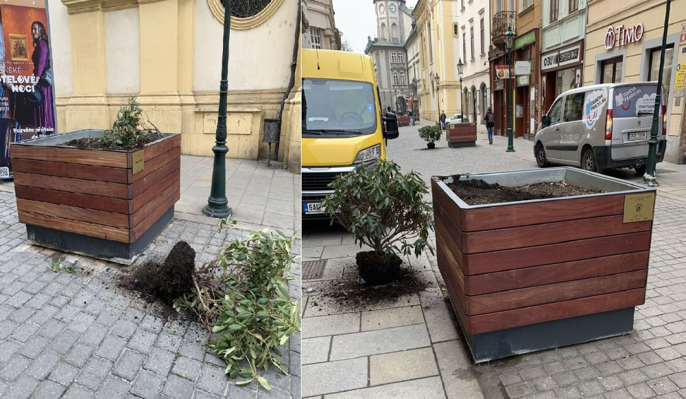 Dvojice vandalů v noci poškodila obří květináče osázené stromy a keři v samotném centru Plzně