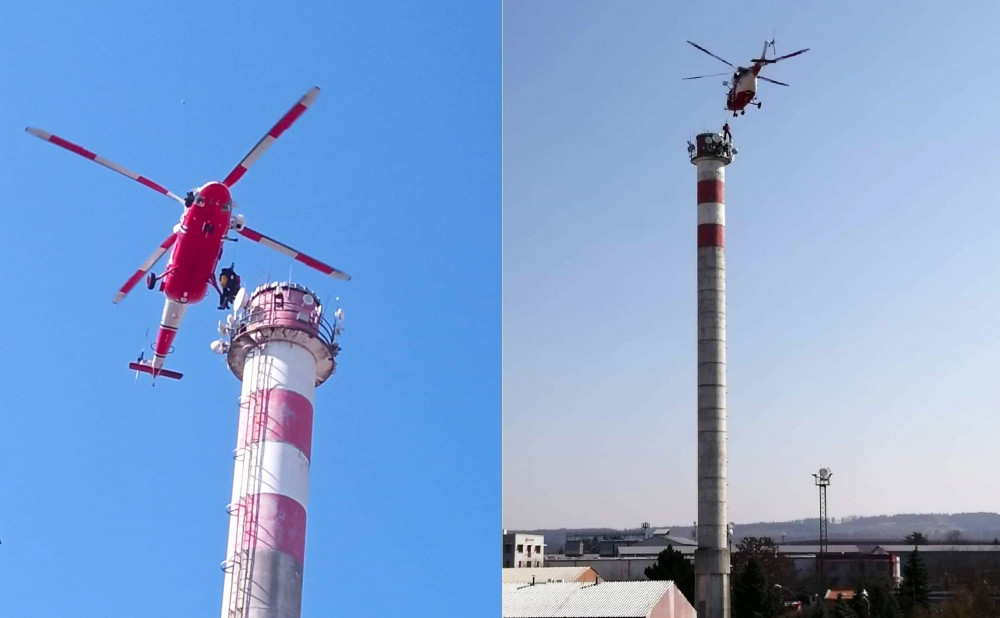 Muž při práci zkolaboval na plošině komína ve výšce asi 50 metrů, záchrana přišla z nebe