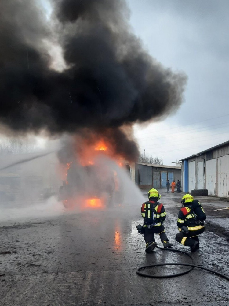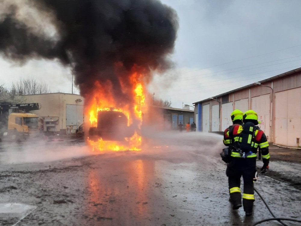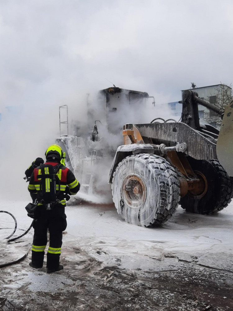 Kolový nakladač se proměnil v obrovskou hořící kouli, hasiči plameny zlikvidovali pomocí pěny