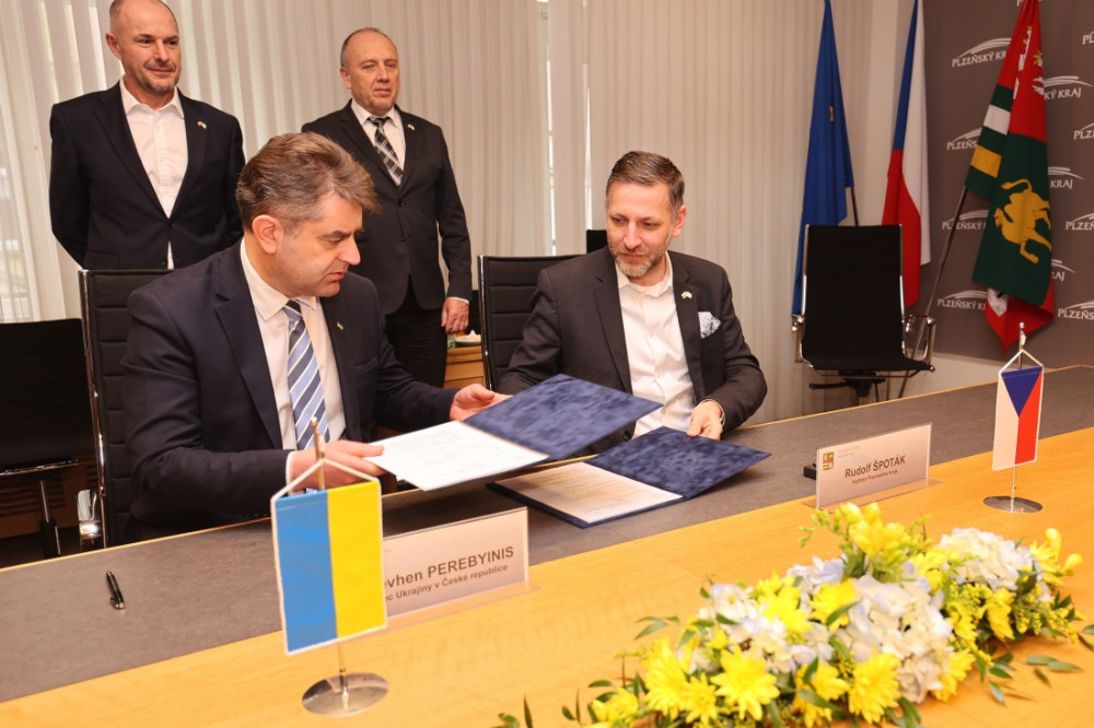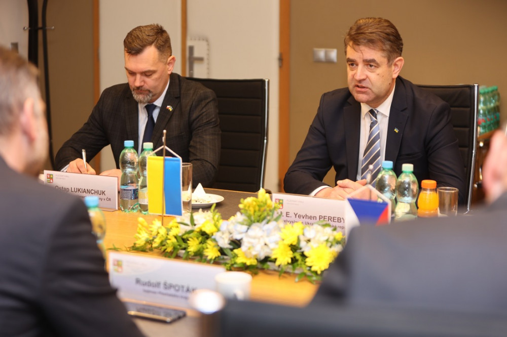 Ukrajinský velvyslanec v ČR Jevhen Perebyjnis a hejtman Plzeňského kraje Rudolf Špoták (Piráti).