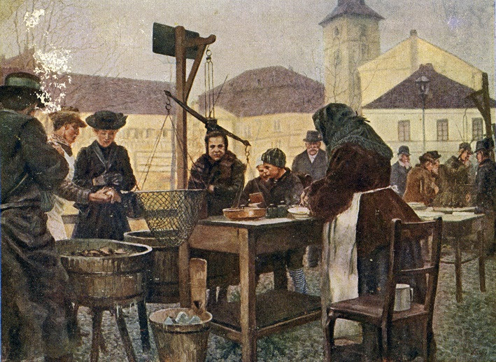 Stará pohlednice s prodejem ryb u Mlýnské strouhy, zdroj: Archiv města Plzně