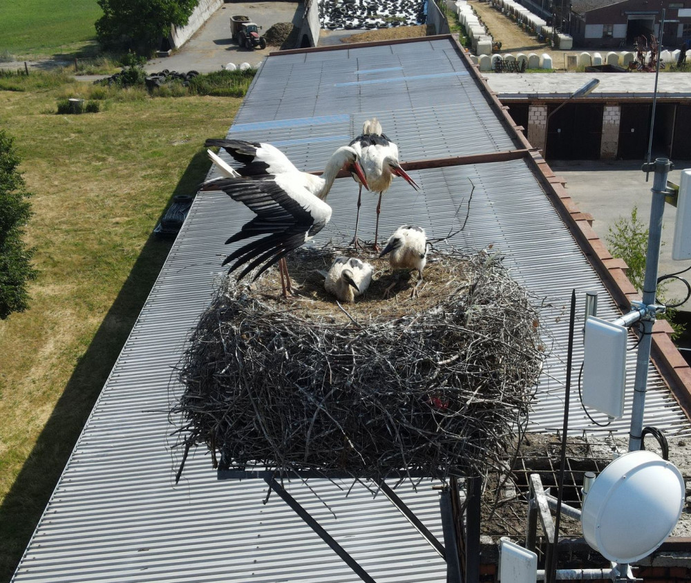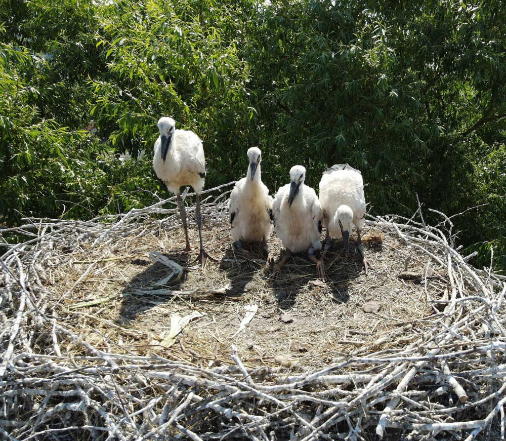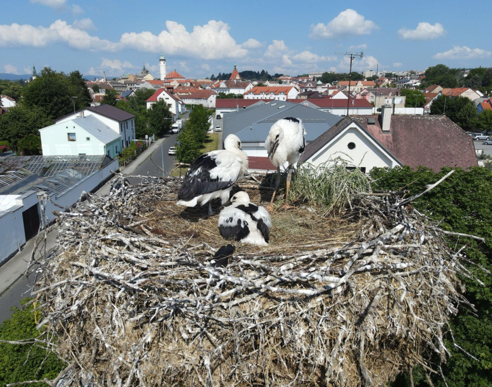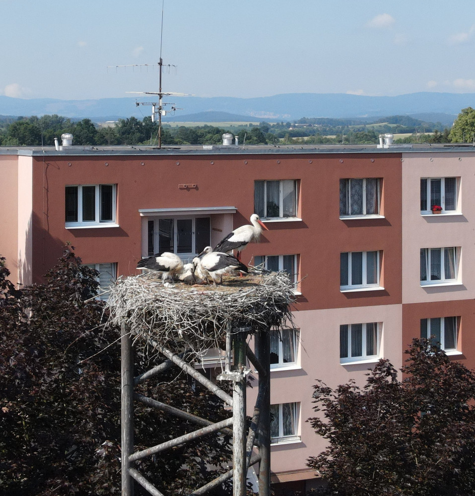V hnízdě v Koutě na Šumavě vyrůstá jedno adoptivní mládě čápa (třetí zleva)