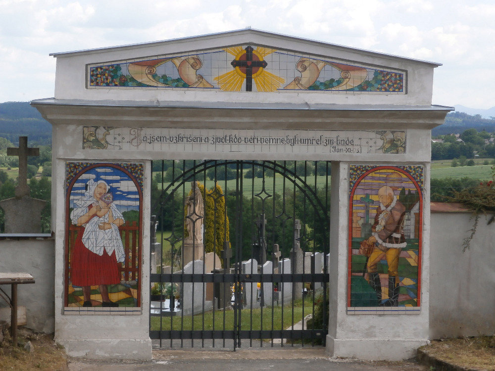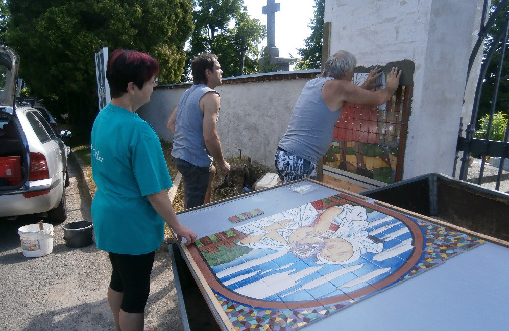 Více než 70 let stará mozaika na hřbitovní bráně v Klenčí opět září novotou