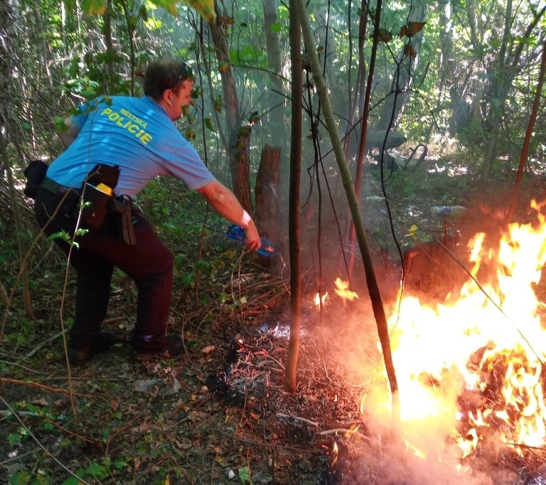 Bezdomovec si v lese rozdělal táborák a plameny neuhlídal, velkému požáru zabránili strážníci městské policie