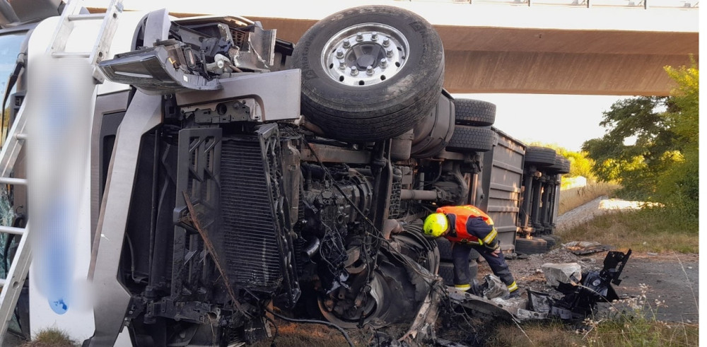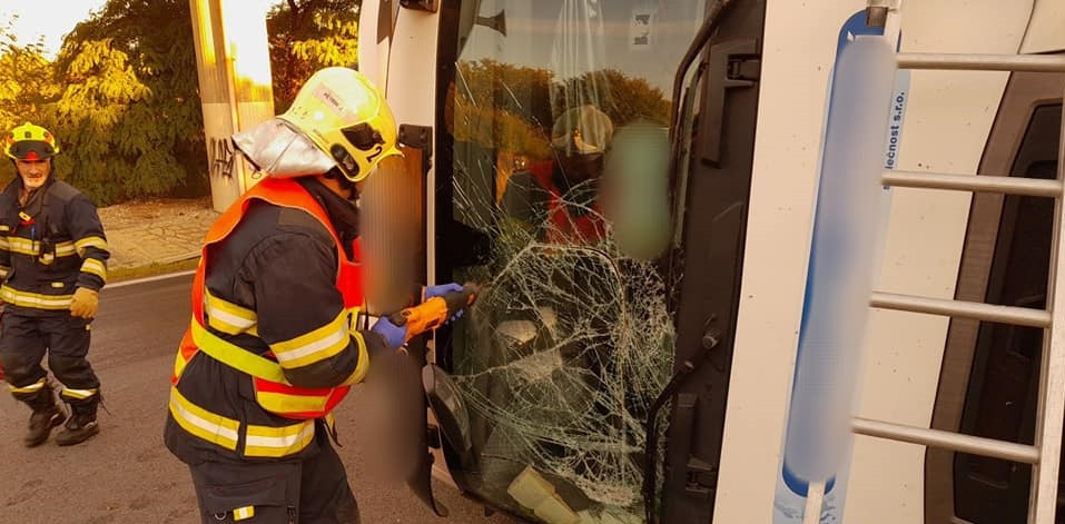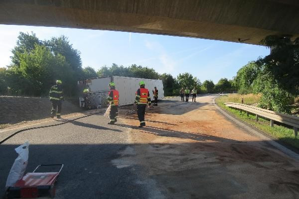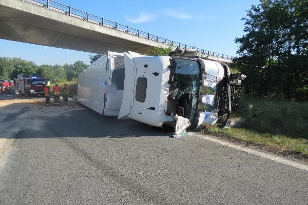 Kamion vletěl rychle do zatáčky a převrátil se na bok, hasiči museli z kabiny vyprostit psa