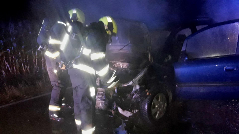 Po srážce s divočákem začalo hořet osobní auto. Zvíře nehodu nepřežilo, řidič skončil v nemocnici