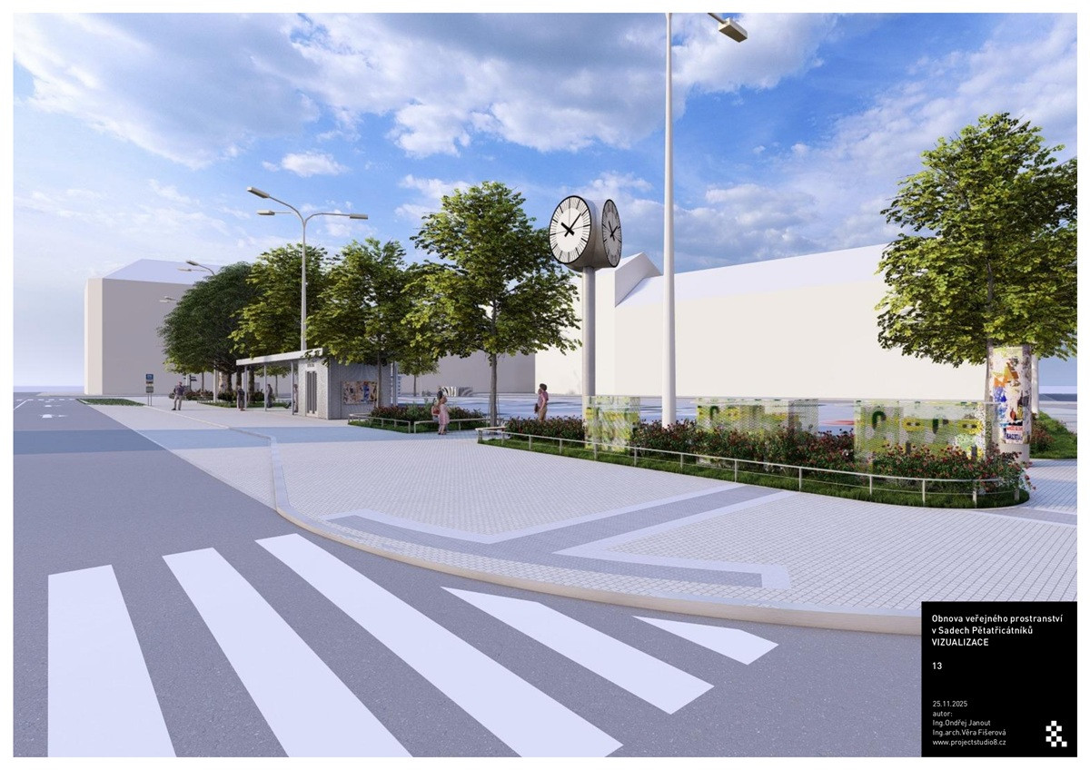 Budoucí podoba sadů Pětatřicátníků, zdroj: projectstudio8Pryč postupně mizí reklamní plochy. Původní kiosky nahradí dva moderní stánky, konkrétně půjde o trafiku s občerstvením. Nový přístřešek získá i zastávka MHD. „Všechny tyto objekty budou mít zelené střechy. Zajímavostí je, že konstrukcí stánku s občerstvením bude prorůstat strom,“ doplnil náměstek s tím, že obměnou projde i mobiliář včetně hodin. Parkovací místa pro invalidy se přesunou blíže k zastávce.