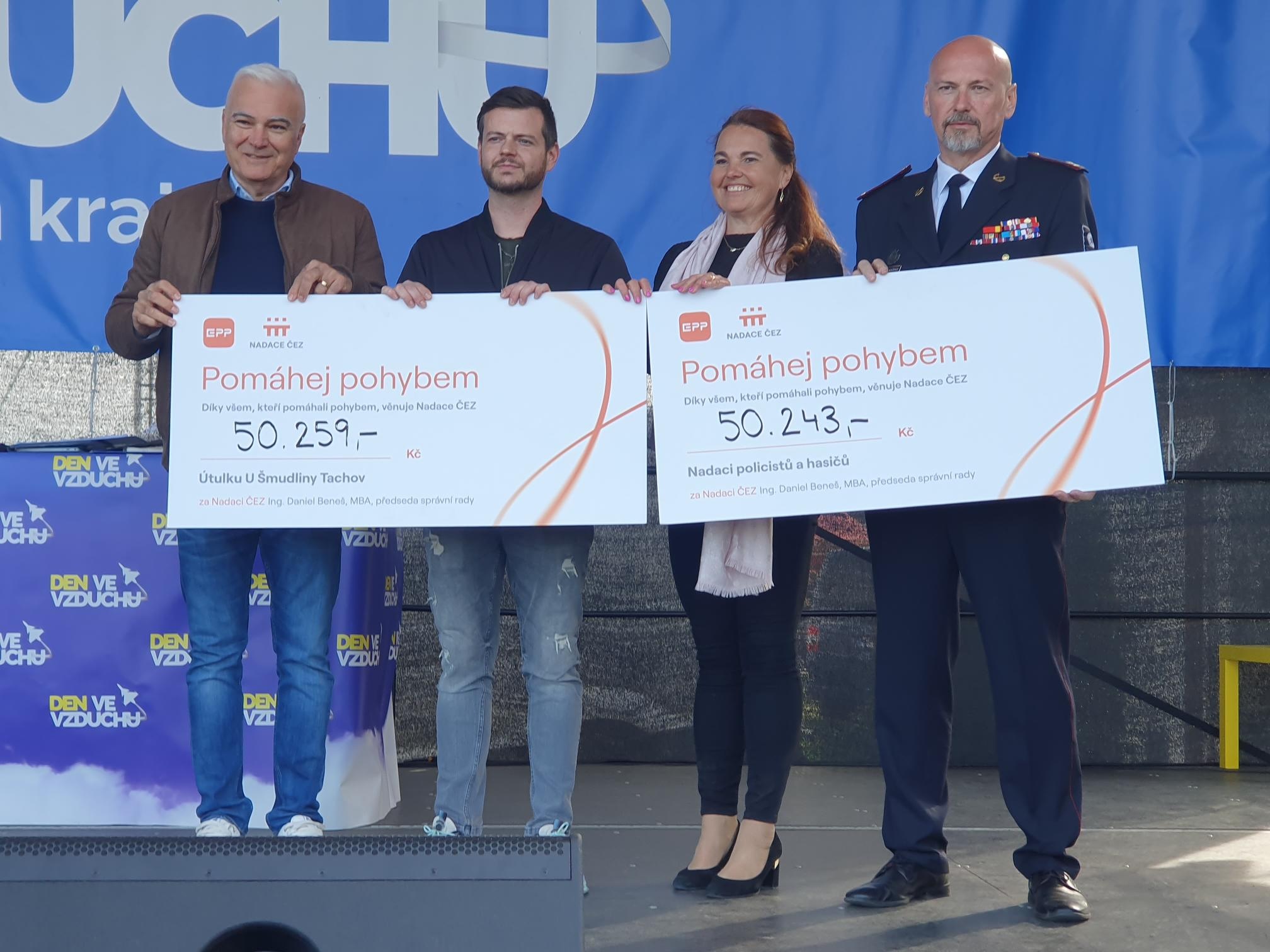 Nadace ČEZ pomáhá pozůstalým dětem hasičů a policistů i zvířecímu útulku. Tradičně dva obdarované neziskové spolky a v souhrnu částka 100 502 koruny, kterou jim na „hendbajcích“ Oranžového kola Nadace ČEZ při minutových spurtech svými sportovními výkony vydělali dospělí i dětští návštěvníci Dne ve vzduchu v Plasích.