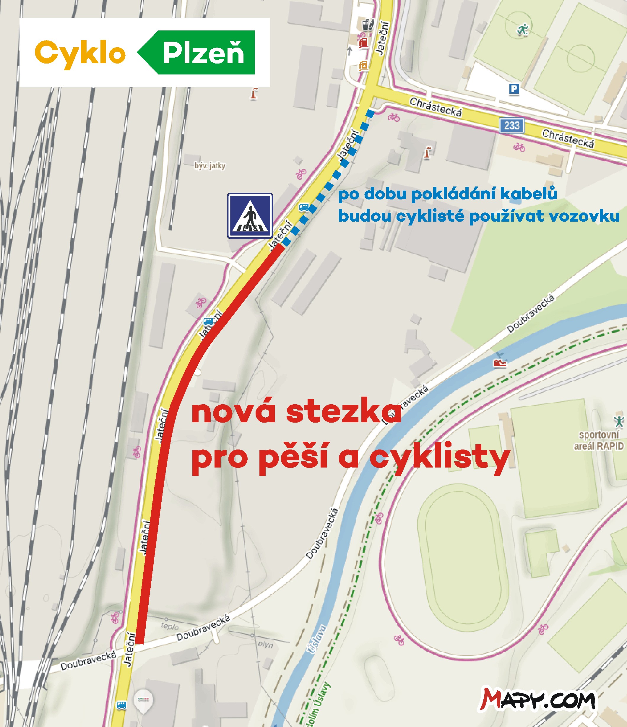 „Konkrétně jde o úsek od křížení Jateční s Doubraveckou ulicí až ke stávajícímu chodníku vedoucímu ke křížení s Chrásteckou ulicí, kde nyní probíhá osazení světelnou signalizací. Stezku oddělí od komunikace II/233 pruh zeleně šířky 2,40 – 3,25 metru, na kterém bude na konci příštího roku vysázena alej patnácti jasanů,“ vyjmenovala mluvčí radnice v Plzni Eva Barborková. Povrch stezky bude z asfaltového betonu.