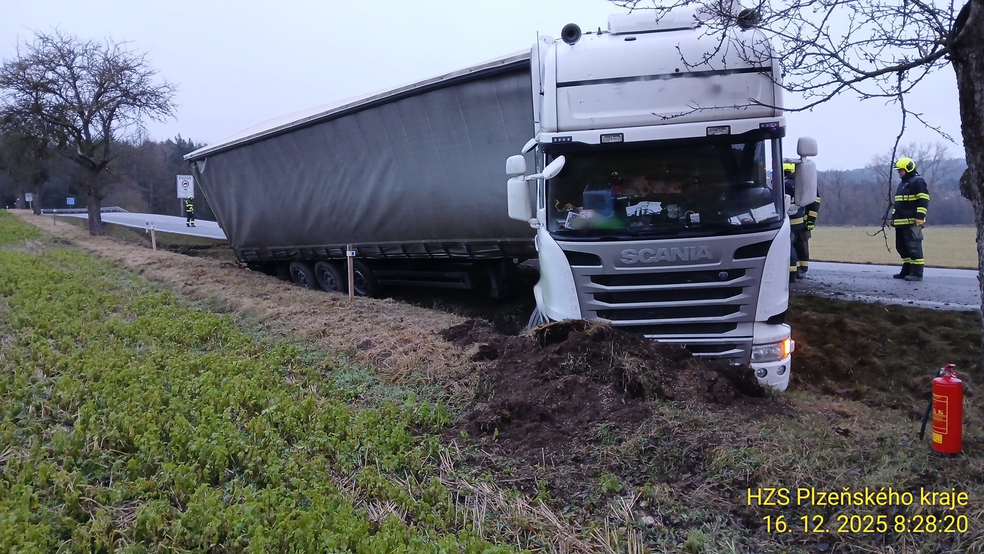 „V 8:15 za Horažďovicemi na silnici I/22, téměř na hranici kraje, havaroval kamion do příkopu. Nehoda se obešla bez zranění. Zajistili jsme místo události a provedli protipožární opatření,“ informoval mluvčí hasičů Petr Poncar. Kamion skončil mimo vozovku, doslova zapíchnutý do hlíny v příkopu.